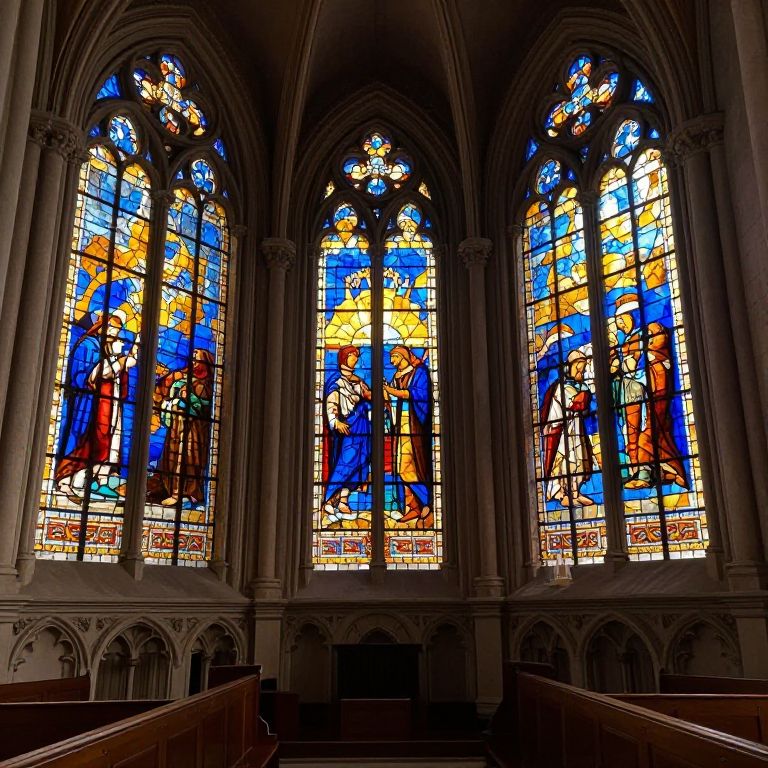 Stained glass windows illuminate a grand cathedral interior, casting vibrant hues of blue, yellow, and orange across rows of wooden pews, each window narrating distinct biblical scenes framed by intricate Gothic arches and columns.