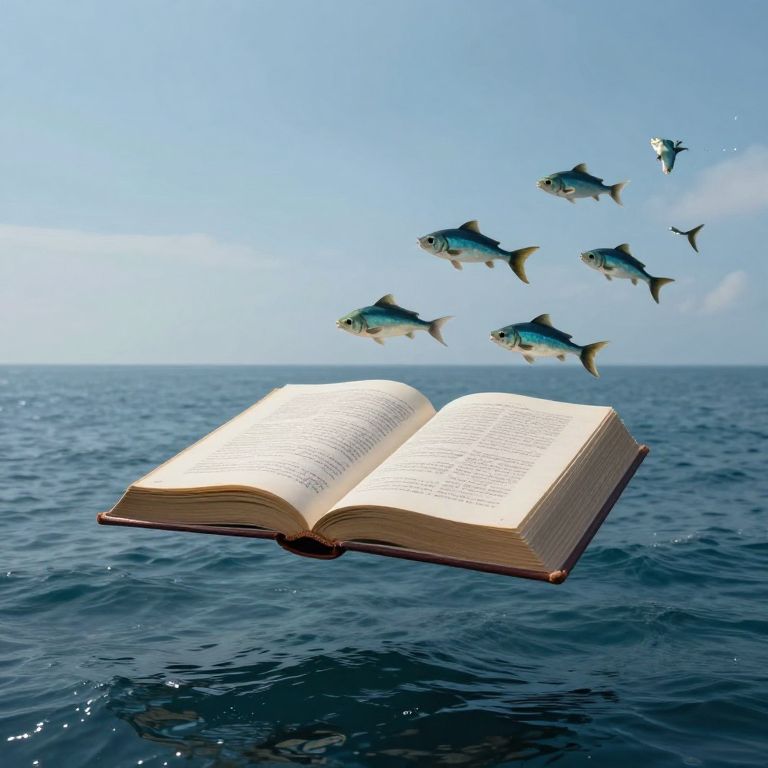 Amidst the boundless expanse of sea and sky, a colossal book hovers serenely, its pages turned by ethereal fish soaring through the air, symbolizing the timeless dance between knowledge and wonder, where forgotten stories find new life in the currents of imagination.