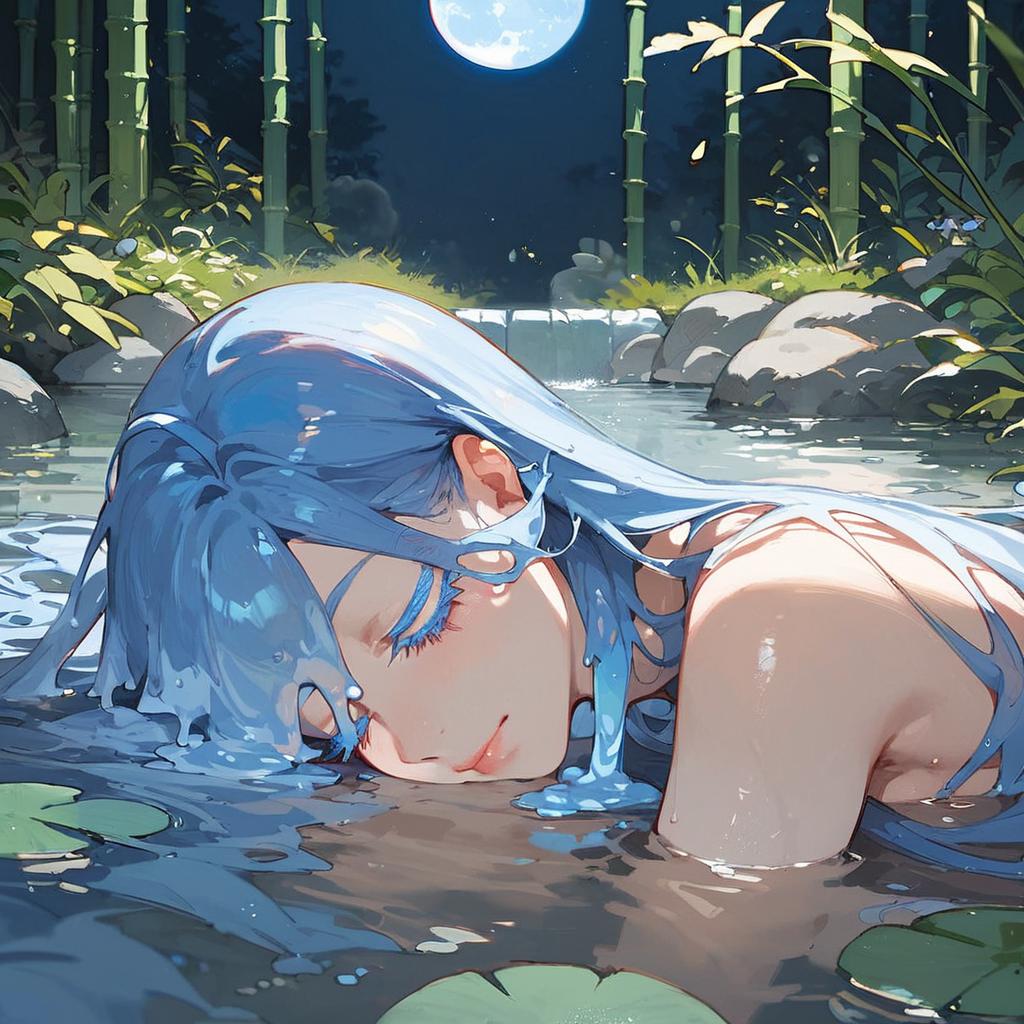 Masterpiece, high quality, highres, 1girl, solo, ophesyle, water, partially submerged, closed eyes, emotionless, branches, swamp, (blue hair ), long hair, night, from side