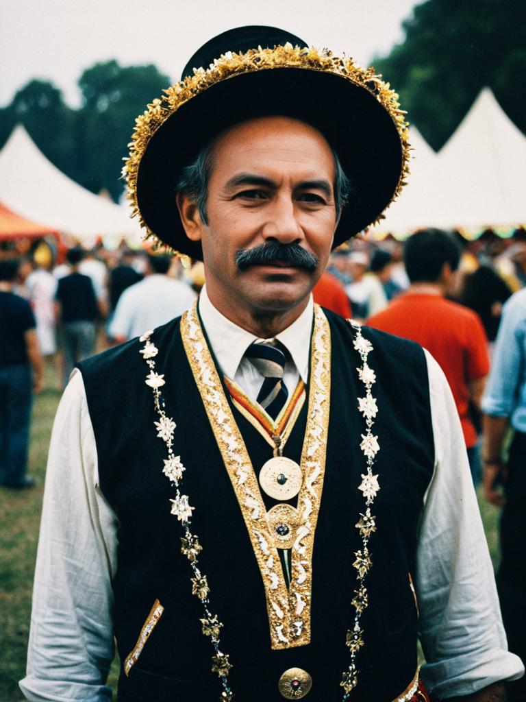 Portrait of a man wearing a traditional festival costume featuring a decorated vest with intricate gold embroidery, metallic accents, and floral designs over a white shirt. The man has dark hair styled back and a mustache, standing outdoors with blurred festival tents and attendees in the background.