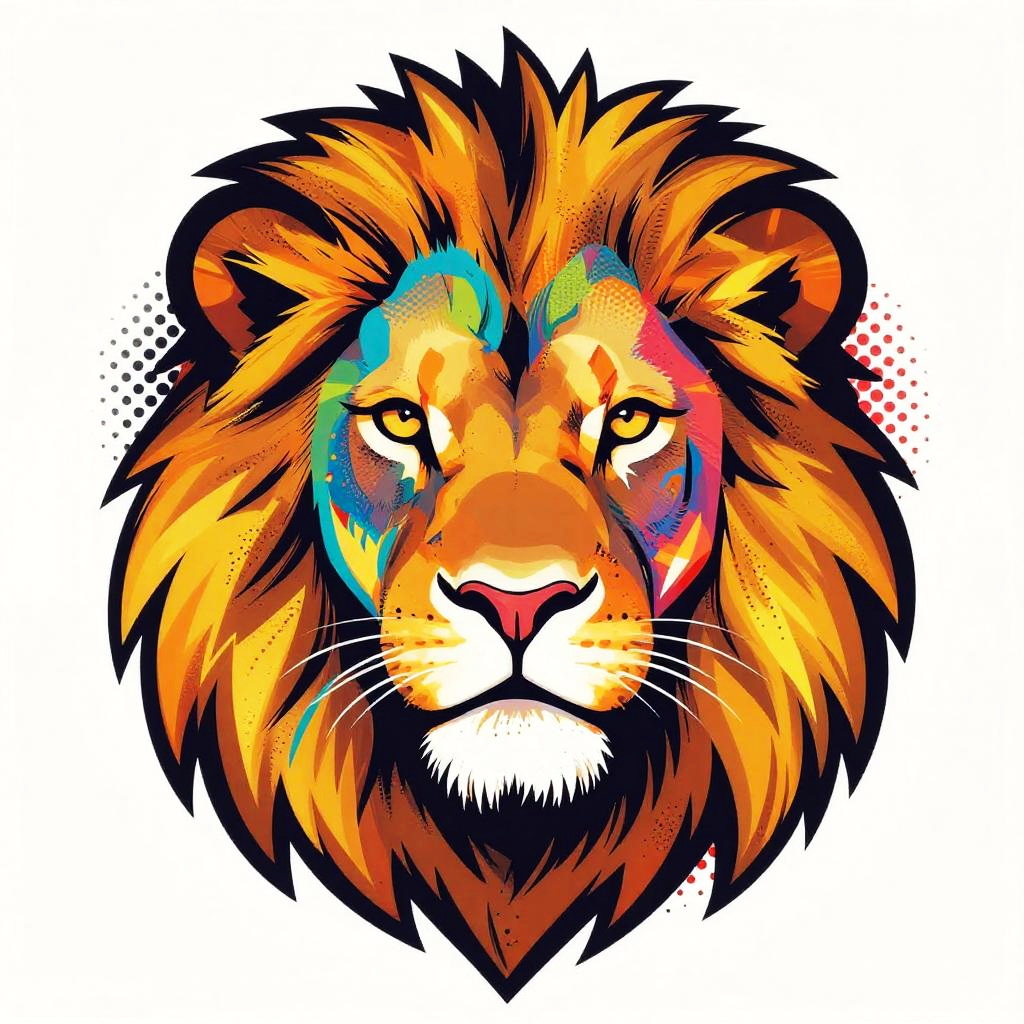 Lion pop art featuring a majestic lion's face divided into vibrant colorful panels, bold black outlines, and comic book style dots, set against a bright contrasting background, capturing energy and power with a modern twist.