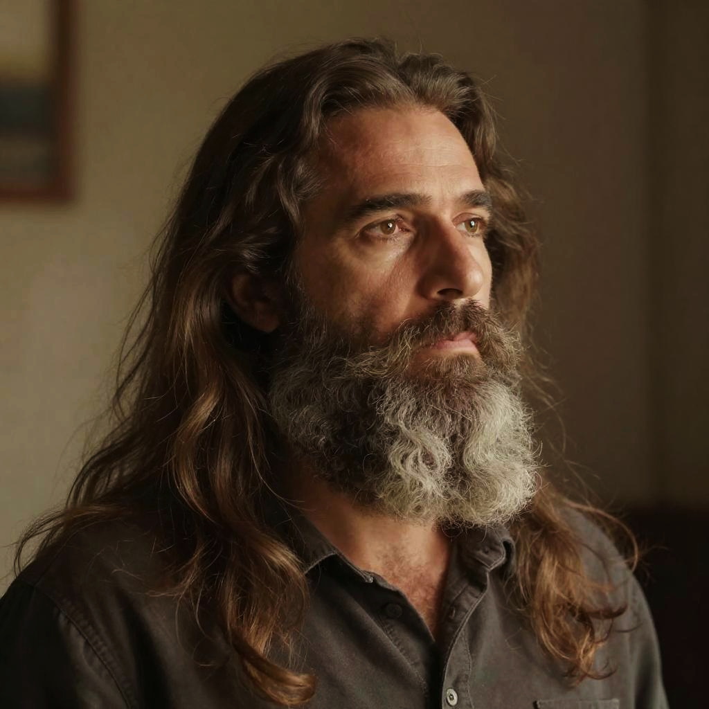 This is a black-and-white photograph of an elderly man with a long, flowing white beard and wavy, shoulder-length hair. His deep-set eyes look slightly to the right, and his expression is contemplative. He is wearing a dark jacket over a light-colored shirt. The high-contrast image emphasizes the textures of his beard and hair, with the white background creating a stark, dramatic effect. The photo is highly detailed, capturing the wrinkles and lines on his face, adding to his wise and aged appearance.