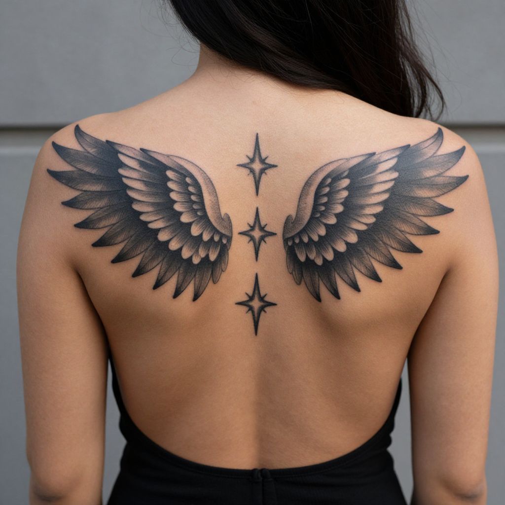 Photograph of a woman's back showing a detailed black tattoo. The tattoo features symmetrical black wings with sharp, feather-like details, and three central star-like shapes. She has light brown skin and is wearing a black, open-back top. Her dark brown hair is visible at the top of the image. The background is blurred and gray.