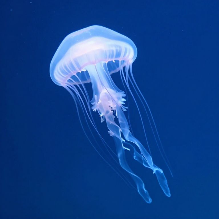 Gracefully drifting through the deep azure expanse, a translucent jellyfish with a luminous bell and cascading tendrils of bioluminescent hues pulses softly, its ethereal glow illuminating the serene underwater world around it.