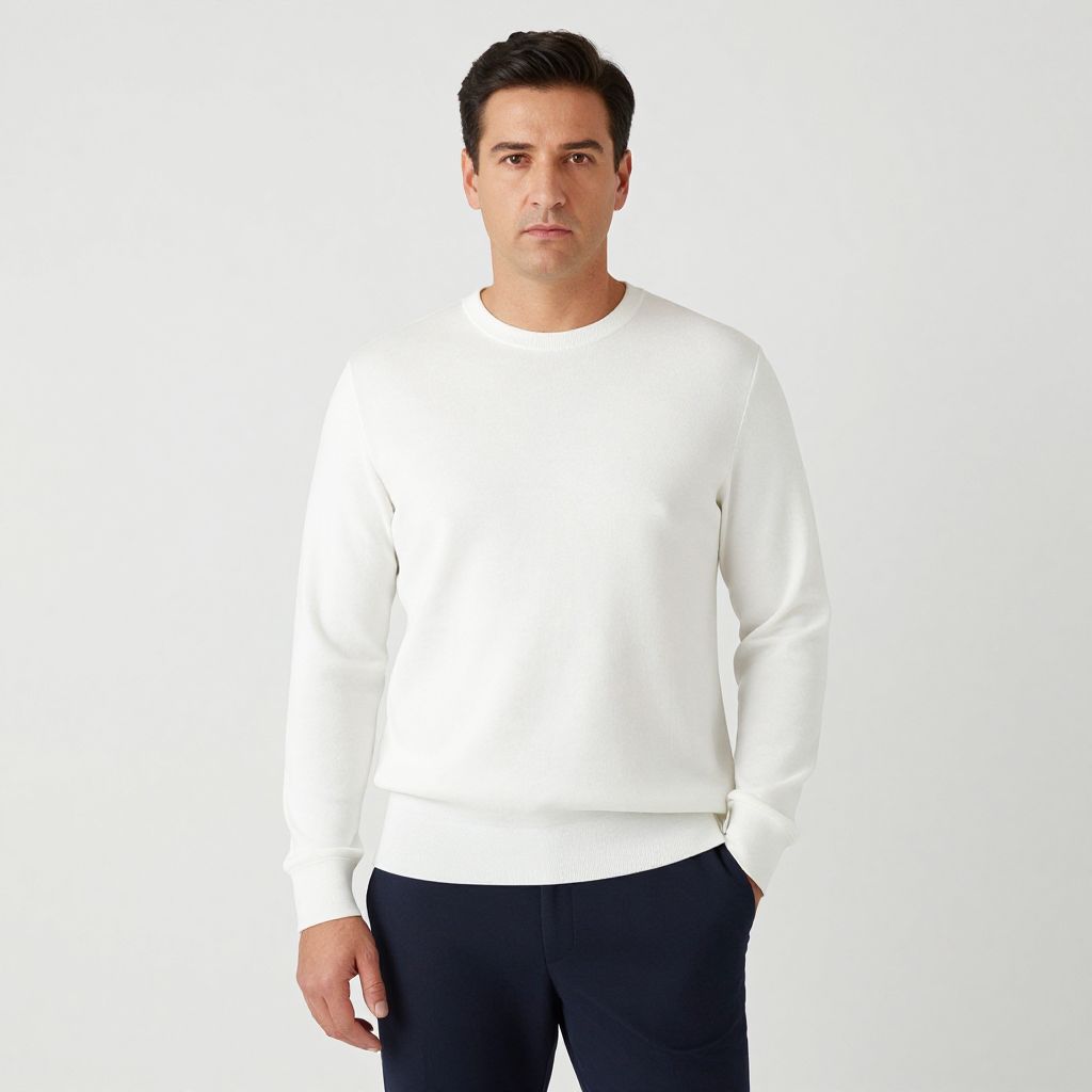 Photograph of a medium-build man with short, dark hair and fair skin, standing against a plain white background. He's wearing a plain white, long-sleeve sweater and dark navy pants, with his right hand in his pocket and his left arm relaxed by his side. He has a neutral expression and is standing slightly angled to the right.