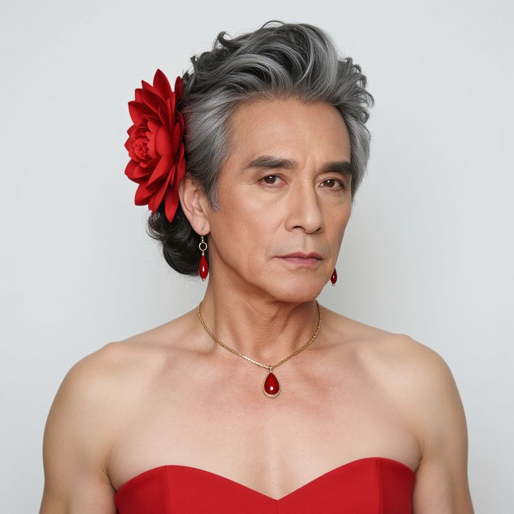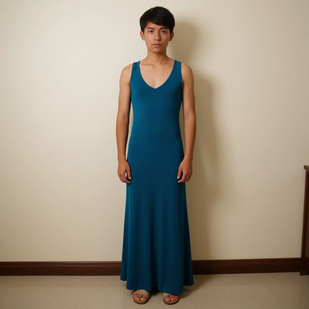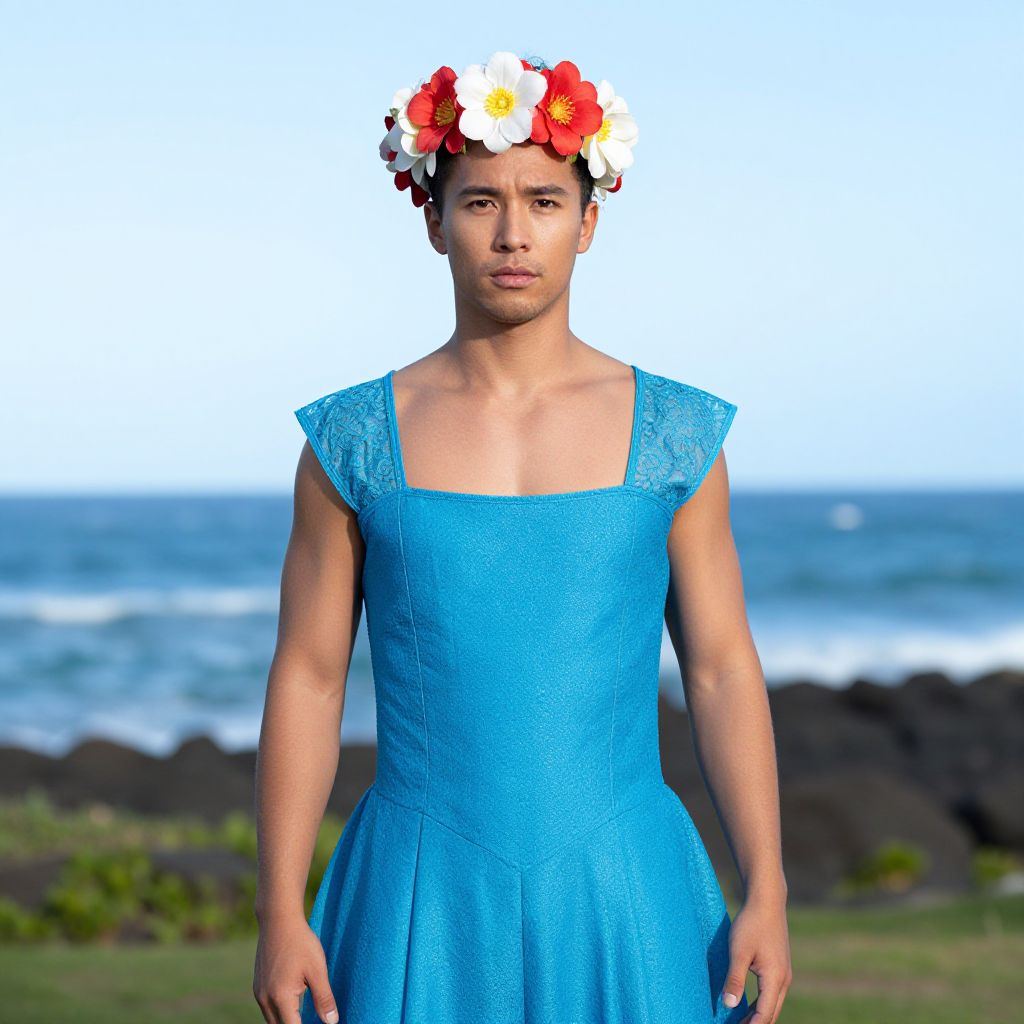 "Maui Costume Fancy Dress, man in a blue dress with a flower crown on his head"
