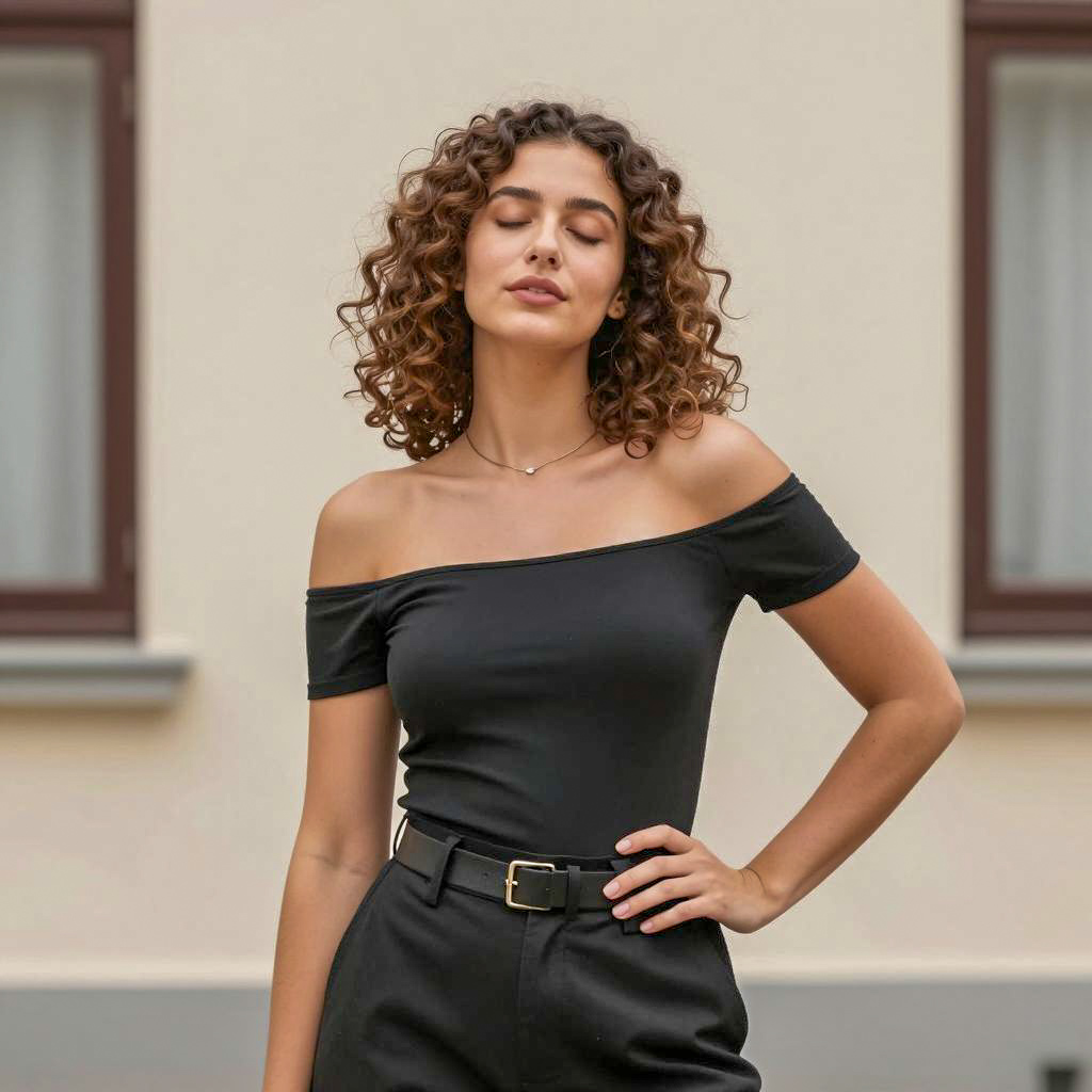 Woman with dark hair in a slicked-back ponytail, wearing a white, one-shoulder, long-sleeve top, and black leather pants. She has red lipstick, gold hoop earrings, and a black shoulder bag with a gold buckle. She is sitting on a black chair by a window, leaning on a white radiator. Her right arm is resting on the radiator, and her left arm is on the chair. Her expression is neutral. Bright natural light from the window.