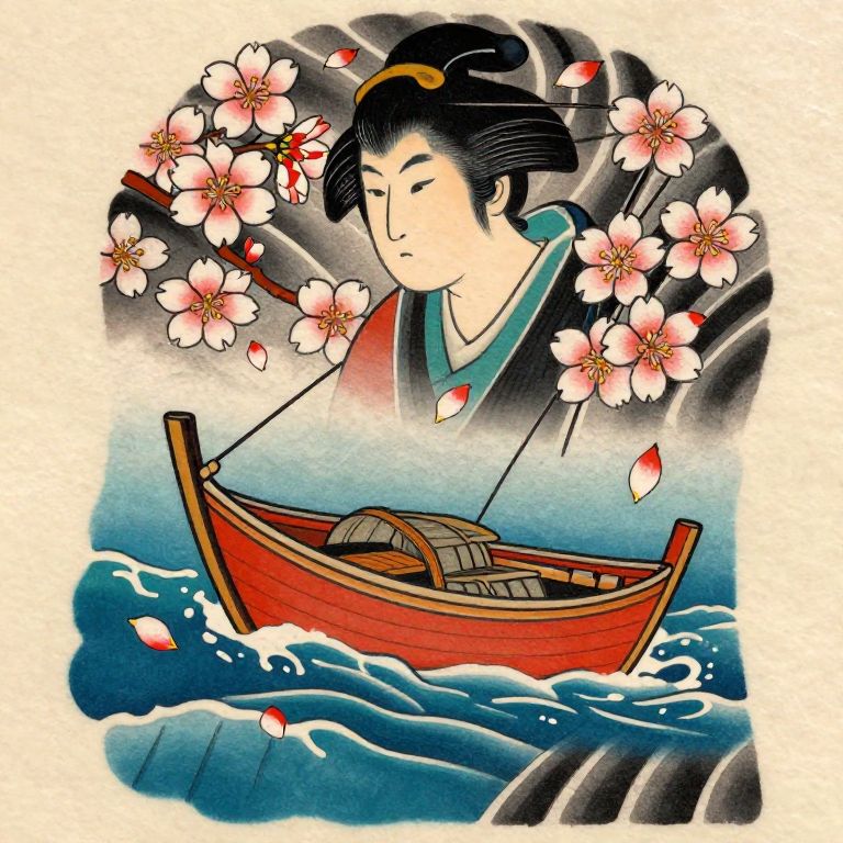 Tattoo of a Japanese boat cruising through misty seas framed by delicate sakura petals, featuring intricate line work and a harmonious blend of blues, reds, and black ink.