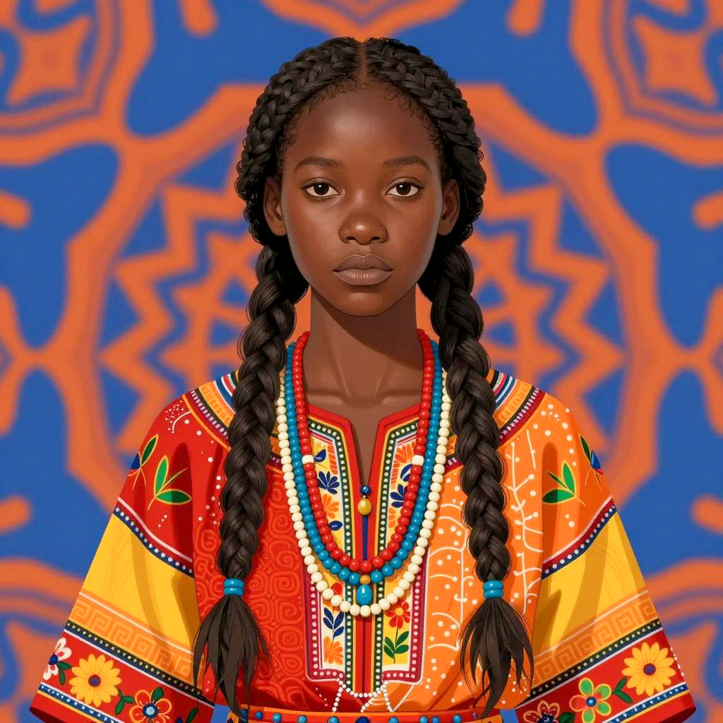 Young woman with dark skin and long braided hair wearing colorful traditional attire with intricate patterns and beadwork. Vibrant red, orange, and yellow fabrics with floral designs cover her chest and sleeves. Multiple bead necklaces adorn her neck. Blue and orange patterned background. Intense, neutral facial expression. Upper body visible. Digital illustration style.