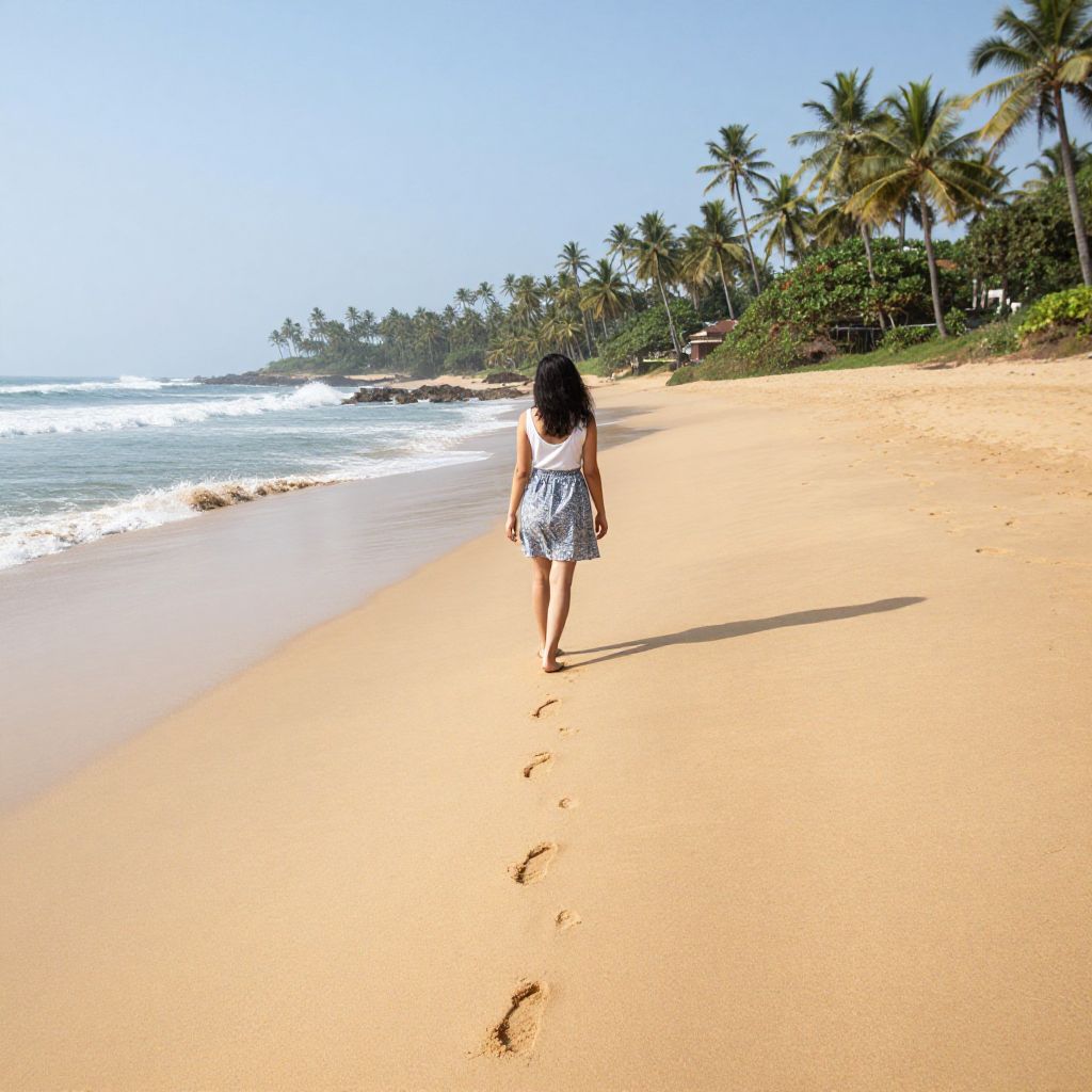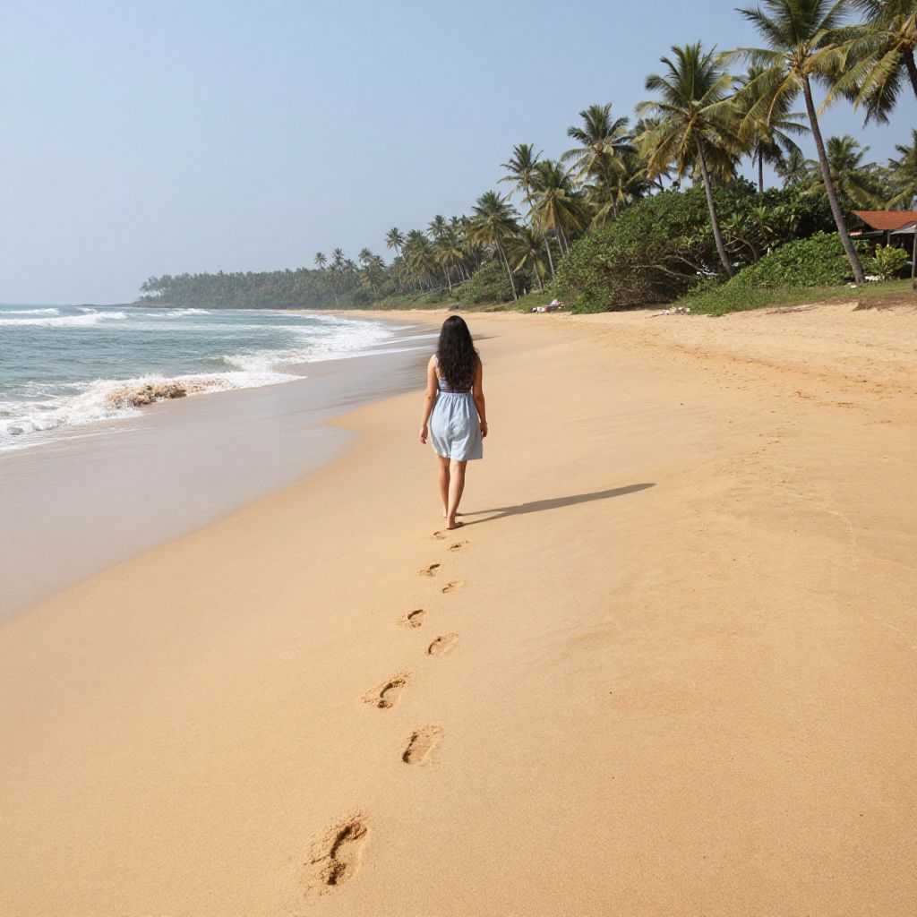 Woman strolling along a serene, deserted beach in Niraamaya, Kovalam, Kerala, India, Asia, leaving distinct footprints in the golden sand as waves gently lap against the shore and palm trees sway in the background.