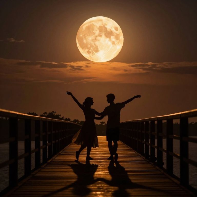 Silhouetted couple dancing on wooden bridge under a glowing full moon, arms raised, reflecting on water, dark orange sky, photograph.