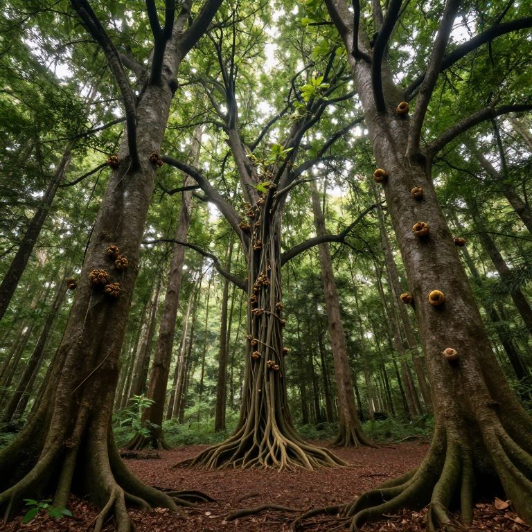 A forest where trees grow in reverse — roots bloom at the sky, and fruit falls upward into hidden gravity wells.