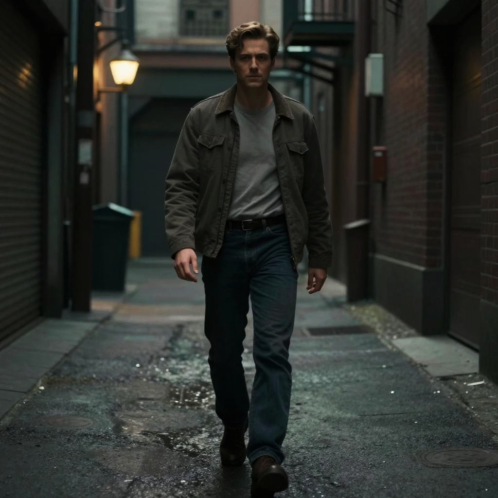 A photograph of a serious-looking Caucasian man with short brown hair walking down a narrow, dimly-lit alley at night. He wears a dark green, buttoned, military-style jacket over a gray t-shirt, paired with dark blue jeans and brown shoes. The wet, dark asphalt path reflects the streetlights, with brick walls on either side. A single, warm yellow light fixture is visible in the background, adding a soft glow to the otherwise shadowy scene. The alley appears urban and slightly gritty, with a few scattered pieces of debris on the ground.