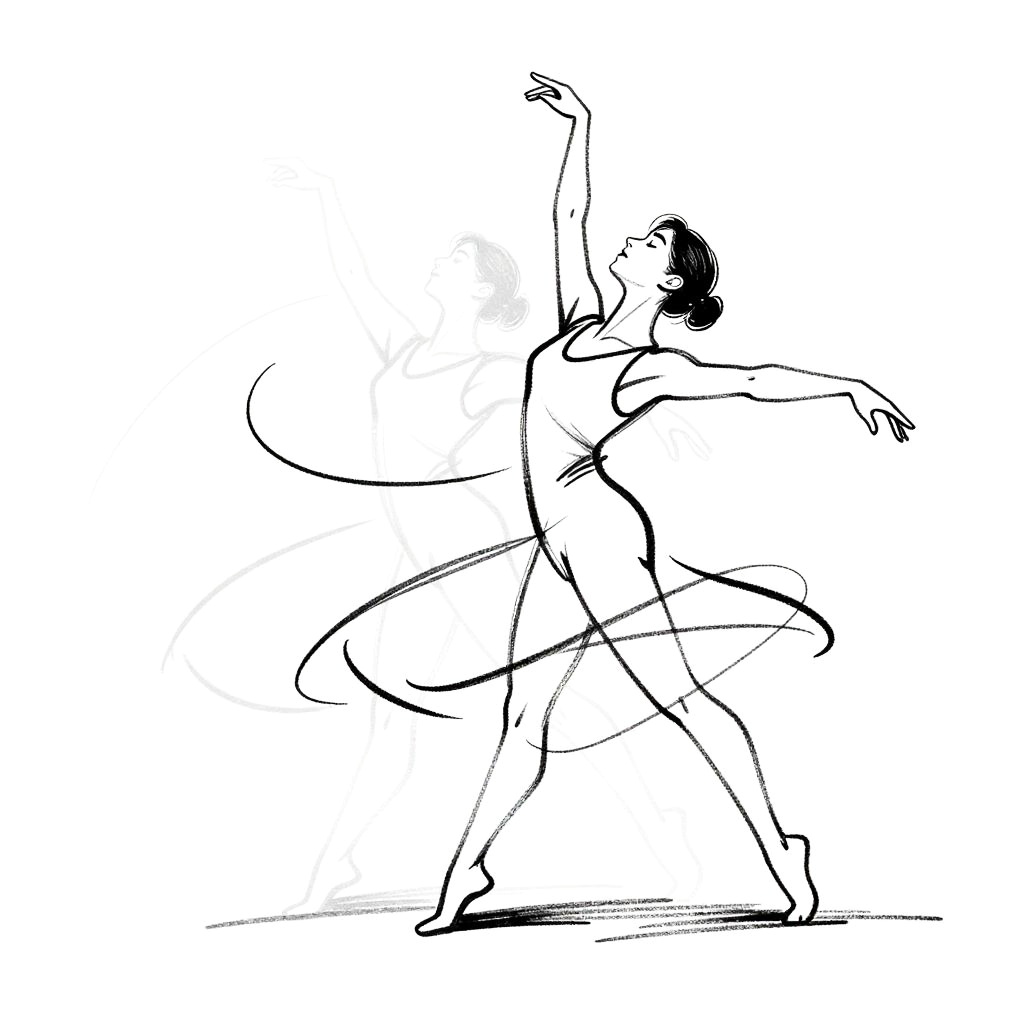 Line drawing AI producing dynamic motion sketches of dancers in movement, expressive and flowing lines capturing energy and grace, minimalist black and white palette, highlighting artificial intelligence's role in creative arts and kinetic figure drawing.
