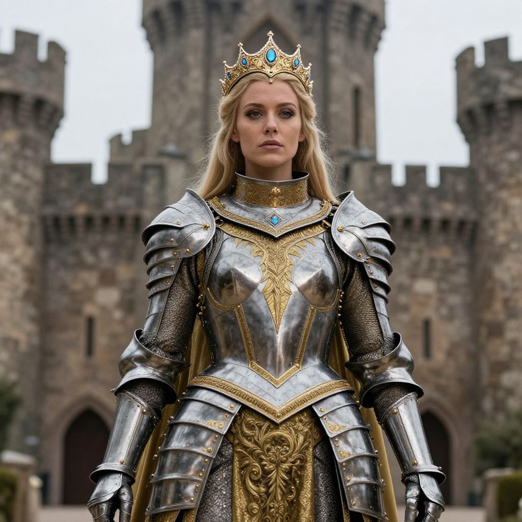 Photograph of a young blonde woman with fair skin, standing in front of a medieval stone castle. She wears an ornate, silver and gold armored suit with intricate patterns, and a jeweled crown adorned with a blue gem. Her expression is serious, with blue eyes looking directly at the camera. The castle in the background has tall, crenellated towers and arched windows. The armor has a shiny, polished texture, and the overall scene has a dramatic, fantasy-like atmosphere. The image is crisp and detailed, emphasizing the regal and warrior-like appearance of the woman.