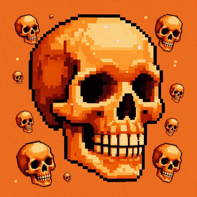 Pixel art of large orange skull with black eye sockets and teeth, surrounded by smaller orange skulls on bright orange background.