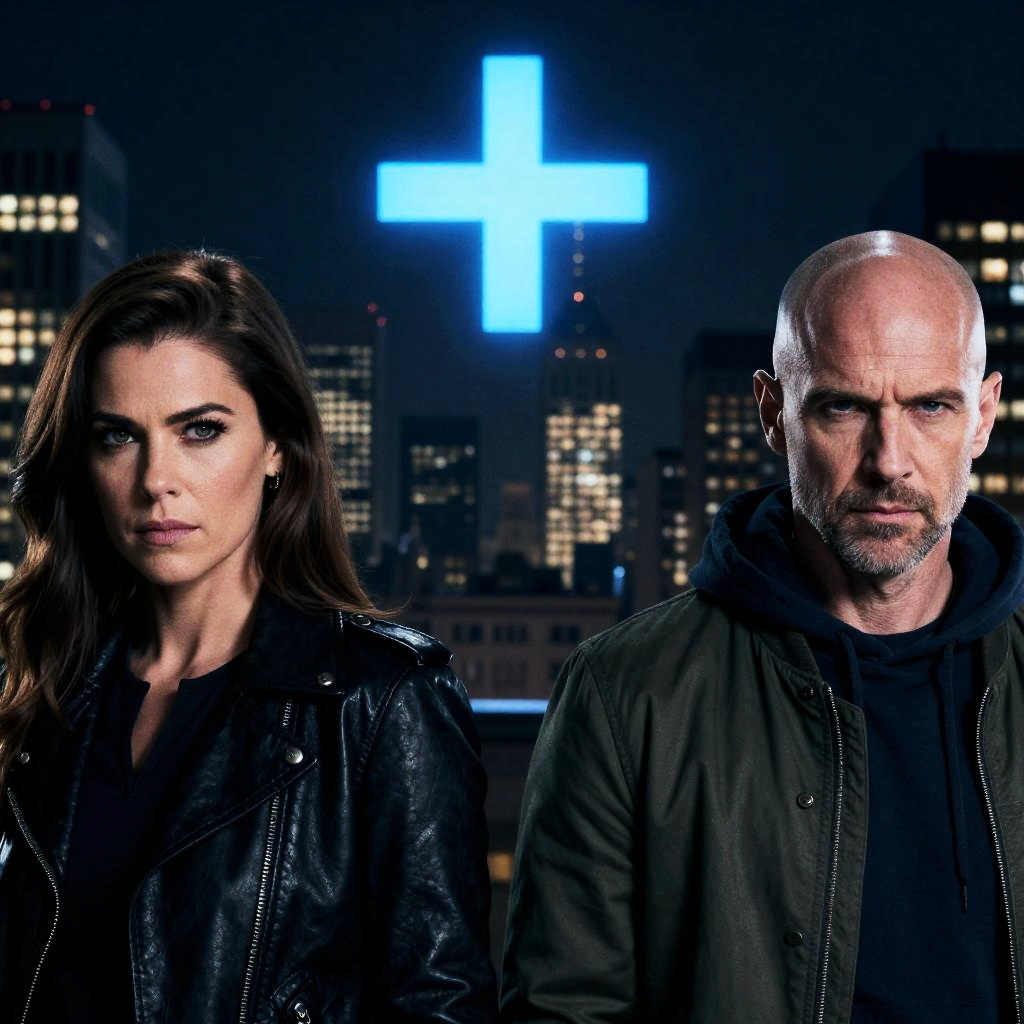 Photograph of two people, a cityscape background, and a glowing blue symbol. Woman on left with long brown hair, black leather jacket, intense expression. Man on right with bald head, hooded jacket, serious expression. Cityscape with tall buildings, lit windows, dark sky. Blue symbol centered above cityscape. Both figures in foreground, cityscape in background.