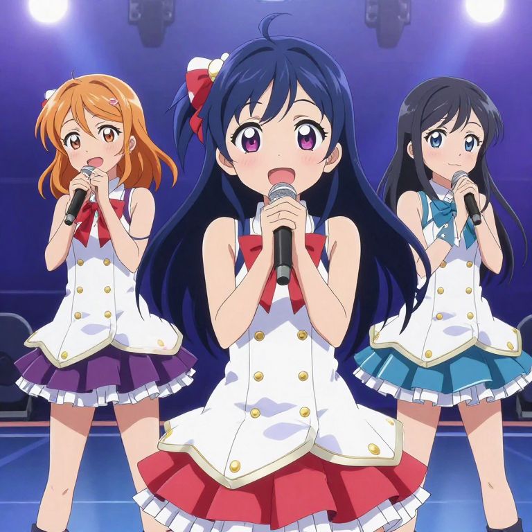 Three vibrant anime-style illustrations depict cheerful schoolgirls in coordinated sailor uniforms, featuring dynamic poses and expressive gestures against a bright, starry background, showcasing the playful and energetic aesthetic characteristic of the \"Love Live! School Idol Project\" series.