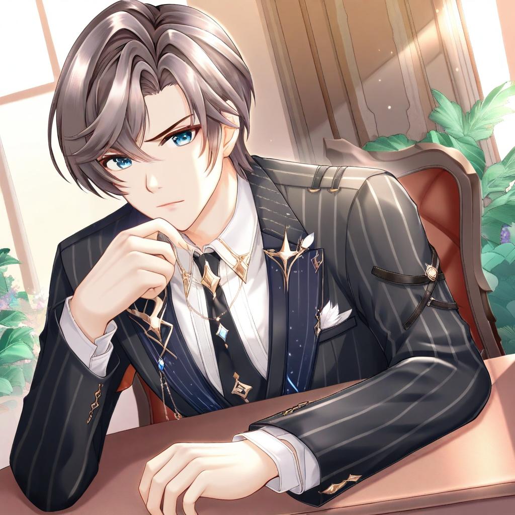 Artem wing (tears of themis), tears of themis, 1boy, blue eyes, brown hair, short hair, white shirt, collared shirt, black jacket, long sleeves, formal, by artist regular mow, animagine