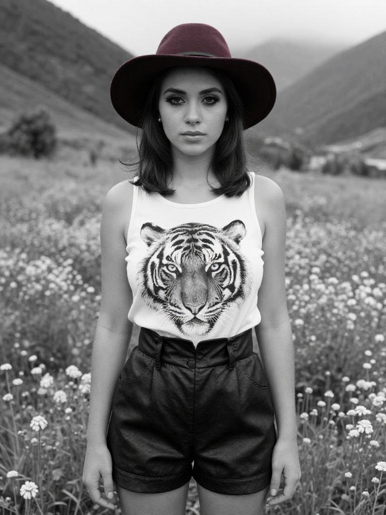A lean woman, casual chic in a graphic tank top featuring a tiger face, tucked into high-waisted faux leather shorts, complemented by a burgundy wide-brimmed fedora, captured in the visual style of Ilford film stock, standing in a floral meadow in a hidden valley. Sexy. Pretty face and beаutiful eyes. Big breasts