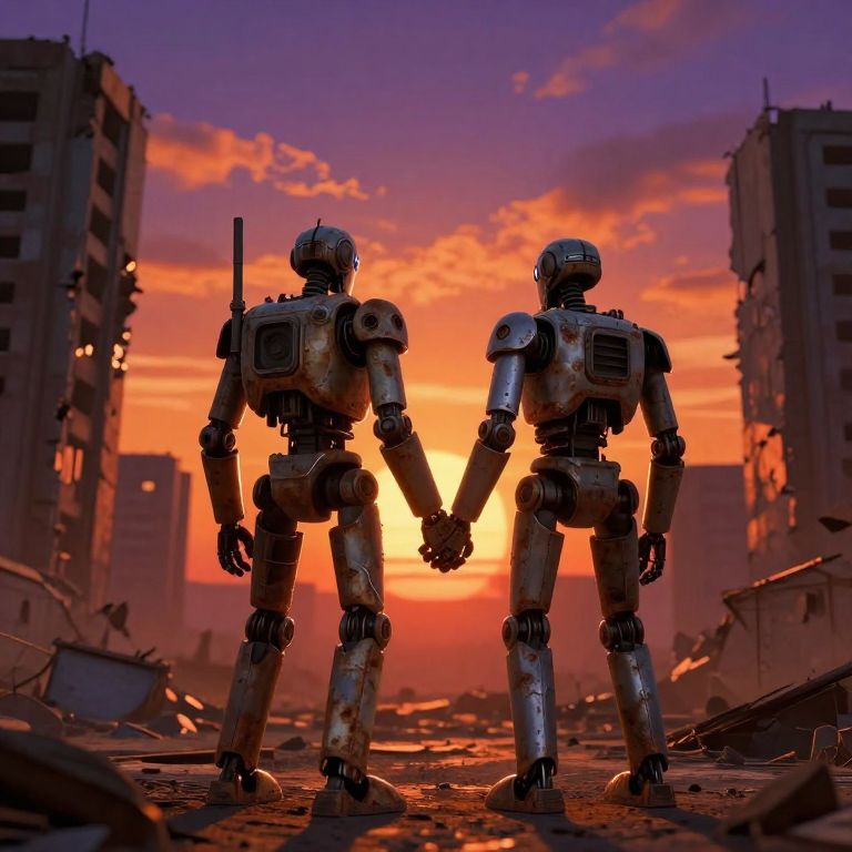 Photograph-like CGI of two metallic, humanoid robots holding hands against a vibrant, orange sunset in a ruined, war-torn cityscape.
