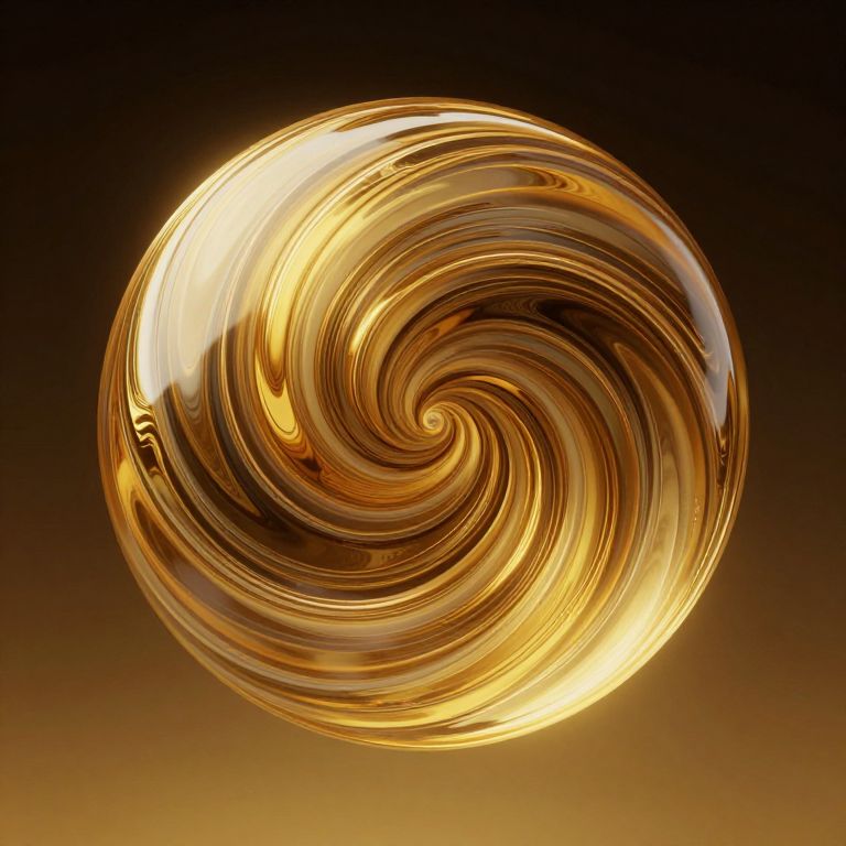 The image presents a mesmerizing, golden orb with intricate, swirling patterns that resemble a fluid, golden spiral. The orb is composed of a series of concentric, wavy lines that create a sense of depth and movement. The colors range from deep, rich golds to lighter, more translucent shades, giving the orb a sense of dimension and texture. The patterns within the orb are complex and interwoven, drawing the viewer's eye inward. The orb is set against a gradient background that transitions from a dark, almost black hue at the top to a lighter, golden tone at the bottom, which enhances the orb's prominence in the composition. The overall effect is one of both attraction and mystique, as if the orb is both inviting and enigmatic, drawing the viewer in with its golden, fluid-like patterns.