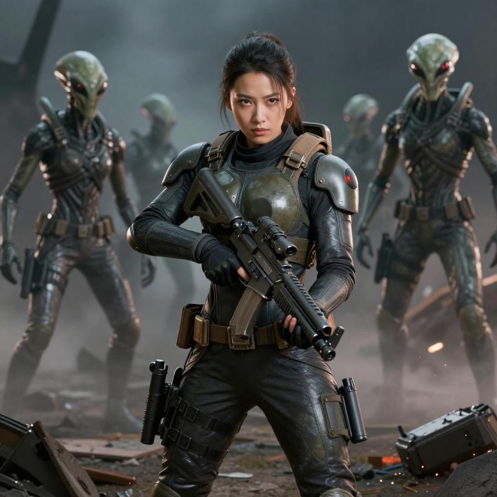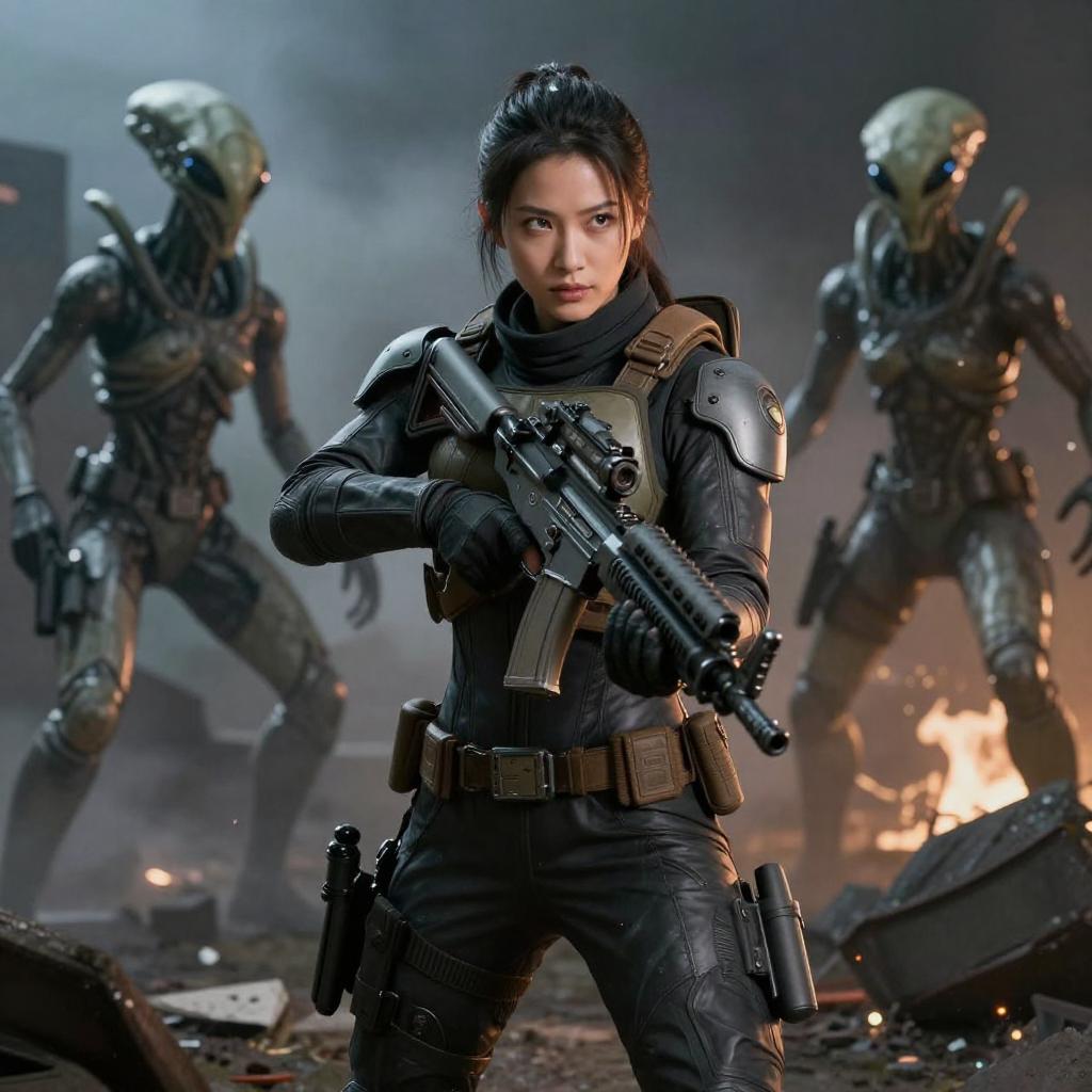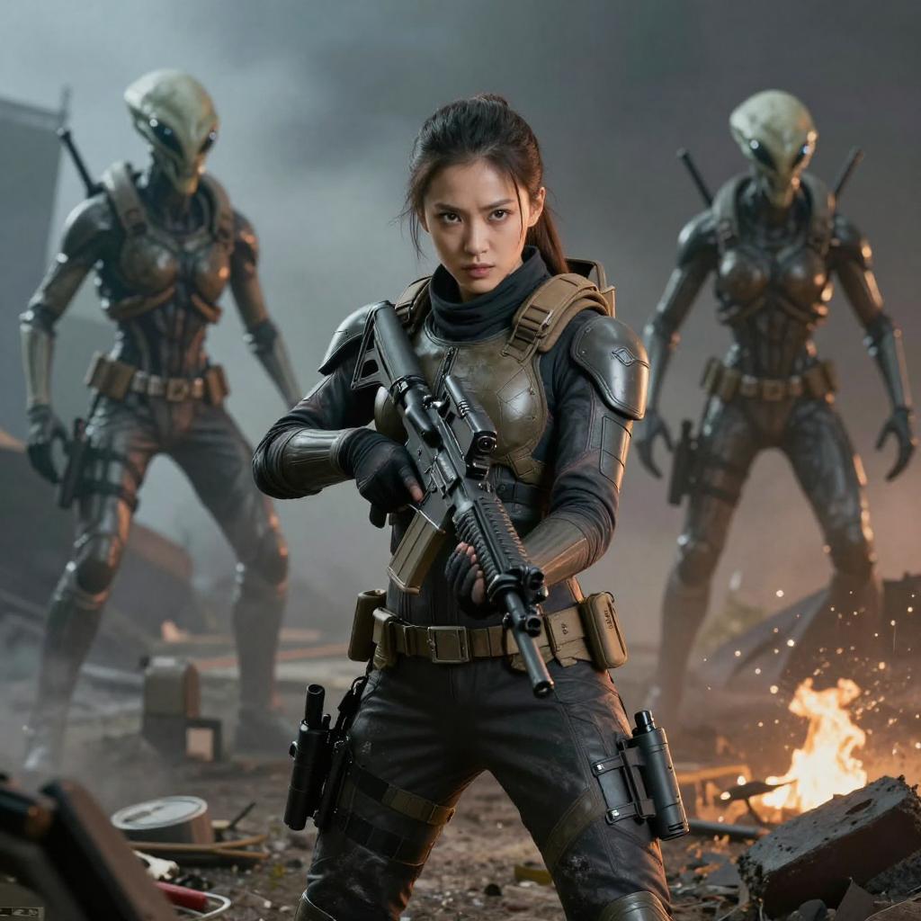 Syberart Create a dramatic and action-packed portrait of a young woman in full combat gear, armed and ready to fight against the alien invaders. Use advanced photography and image editing techniques to realistically capture her intense expression and posture, and play with light and shadow to add depth and drama to the image. Incorporate elements of the battlefield, such as debris and destruction, to add context and visual interest to the image. Make sure the image has high resolution and impeccable image quality to ensure a very realistic and dynamic appearance.