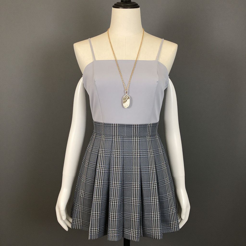 Photograph of a mannequin dressed in a sleeveless, light gray, fitted top with thin straps, paired with a high-waisted, pleated skirt featuring a black and white plaid pattern. The mannequin wears a long gold necklace with a circular pendant. The background is a solid, dark gray color. The mannequin has a white, smooth texture, and the outfit has a modern, chic style. The image is centered and well-lit, highlighting the outfit's details.
