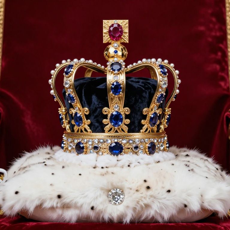 Imposing Britain's Imperial State Crown, adorned with the legendary Black Prince's Ruby at its center, rests atop a plush white fur cushion against a backdrop of deep red velvet, showcasing its intricate gold craftsmanship and array of precious gems, including the Stuart Sapphire and St. Edward's Sapphire, while the Cullinan II diamond gleams subtly below.