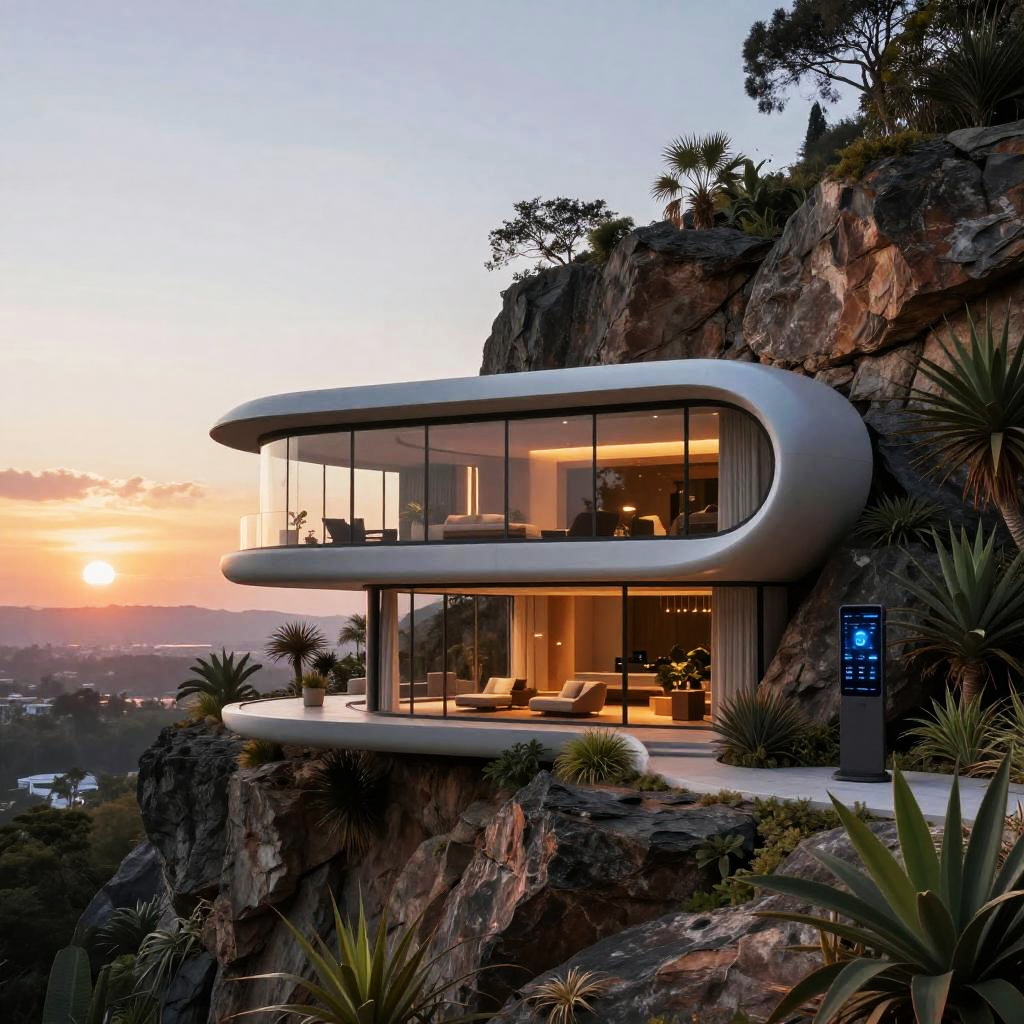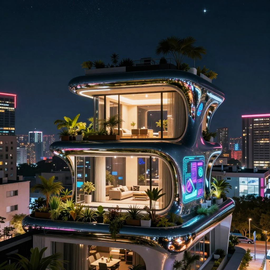 Aerodynamic futuristic home with smooth curves and metallic surfaces, floating above a lush green landscape, illuminated by soft neon lights under a twilight sky.