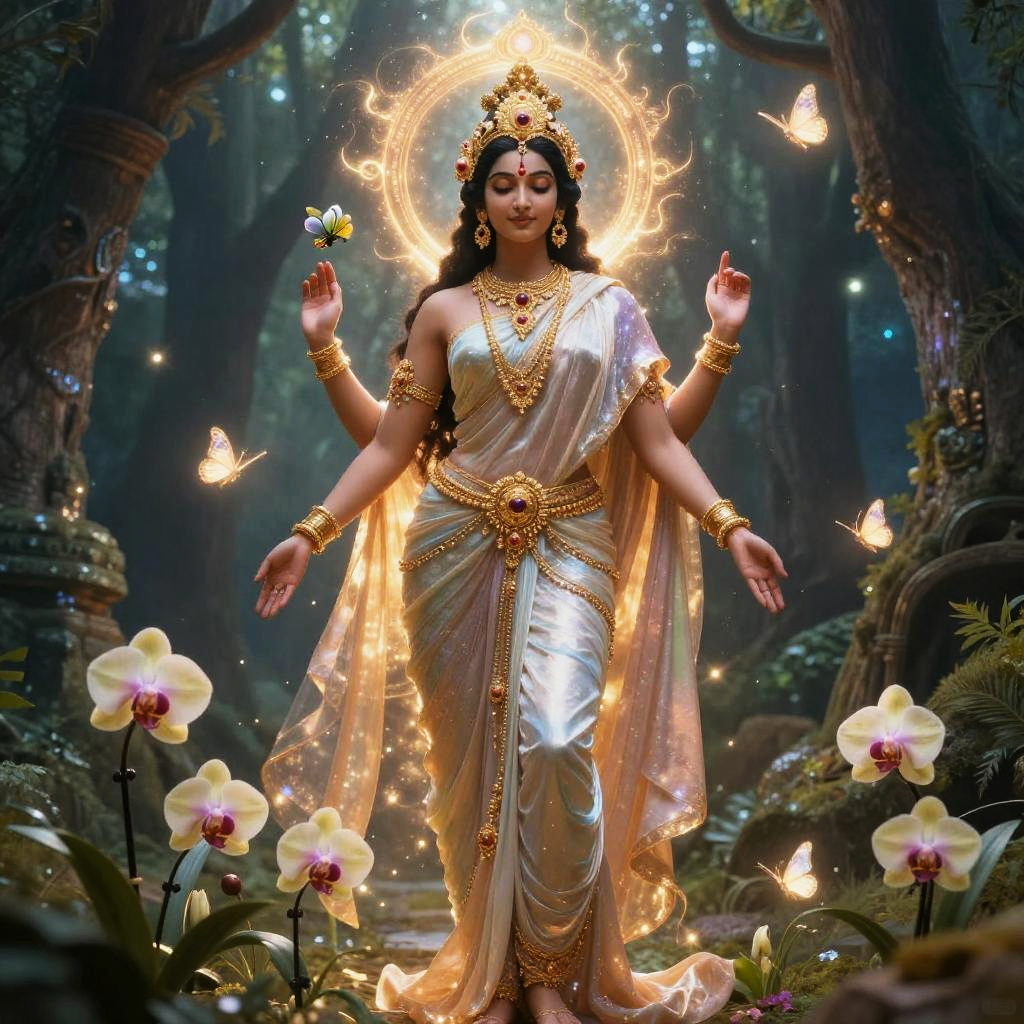 Digital art of a goddess with six arms, wearing a white and gold sari, floating above a starry night sky, surrounded by grazing goats,
