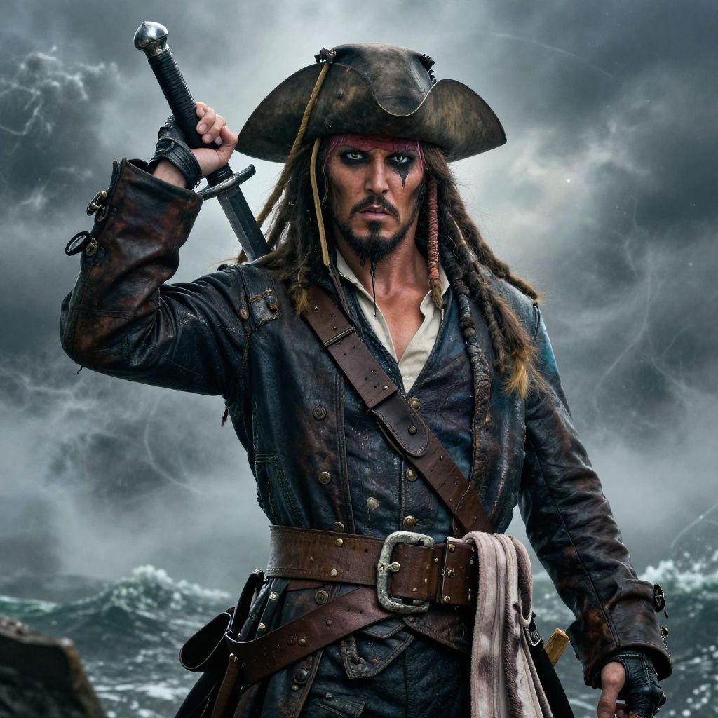 Jack Sparrow Gemini prompt: A adventurous pirate named Jack Sparrow with a bold Gemini-inspired look — sharp features, dual-tone eyes, and a flowing red-and-blue coat — stands atop a floating wreckage in a neon-lit oceancape, holding a glowing gemstone that pulses with starlight. The background features a blend of tropical jungles and futuristic ruins, dynamic lighting and high detail, in a stylized, fantasy-adventure atmosphere.