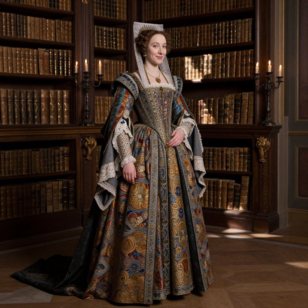 A historically accurate image of a noblewoman from the Italian Renaissance dressed in richly decorated attire — a full gown with lace trim, a bodice with brocade detailing, and a flowing mantua — standing inside a Renaissance palace library, with bookshelves filled with manuscripts and soft candlelight casting gentle shadows on the walls, her face is delicate with a gentle smile and high cheekbones