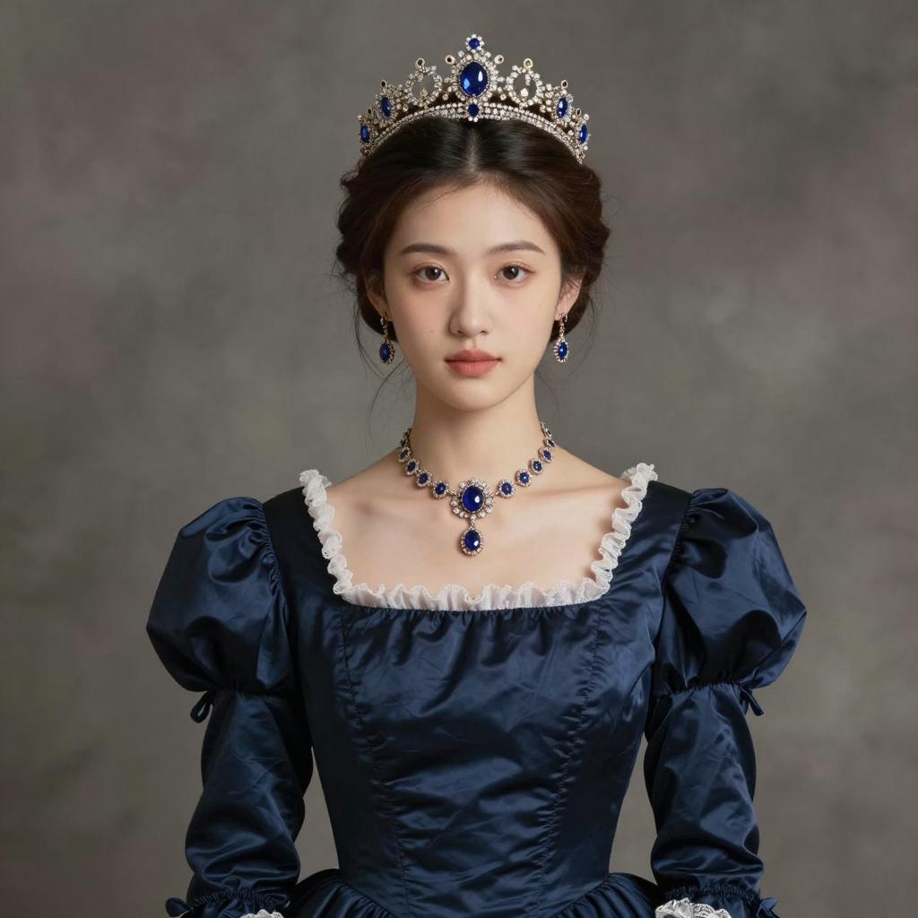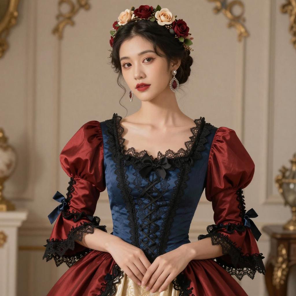 A woman dressed in a luxurious Victorian-style gown with puffed red sleeves and a fitted blue bodice, adorned with intricate black lace details. She wears a matching floral headpiece and statement earrings, posing gracefully against a softly lit, ornate background that enhances the vintage aesthetic.