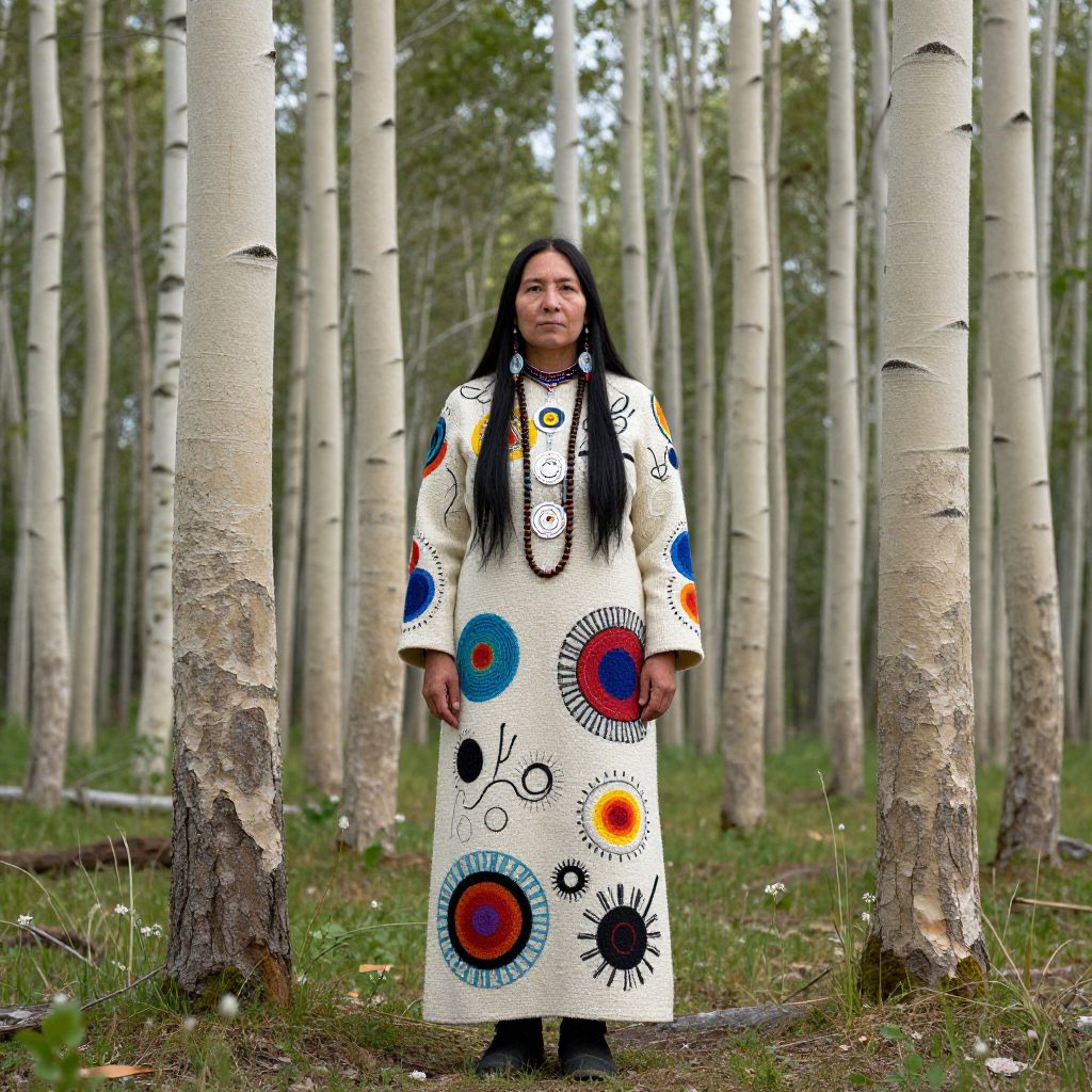 Photograph of an indigenous woman with long black hair, wearing a white traditional dress with colorful circular patterns, standing in a birch forest.