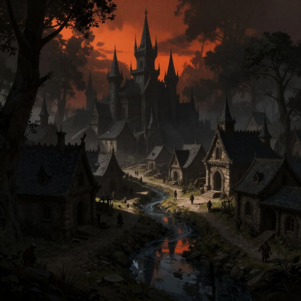 Whimsical art style inspired by Tim Burton, Edward Gorey depicting a somber raven perched on a spiraling rooftop, gazing down at a quaint but eerie village shrouded in fog, with smoky greys and muted blues, sepia browns giving a vintage aesthetic.