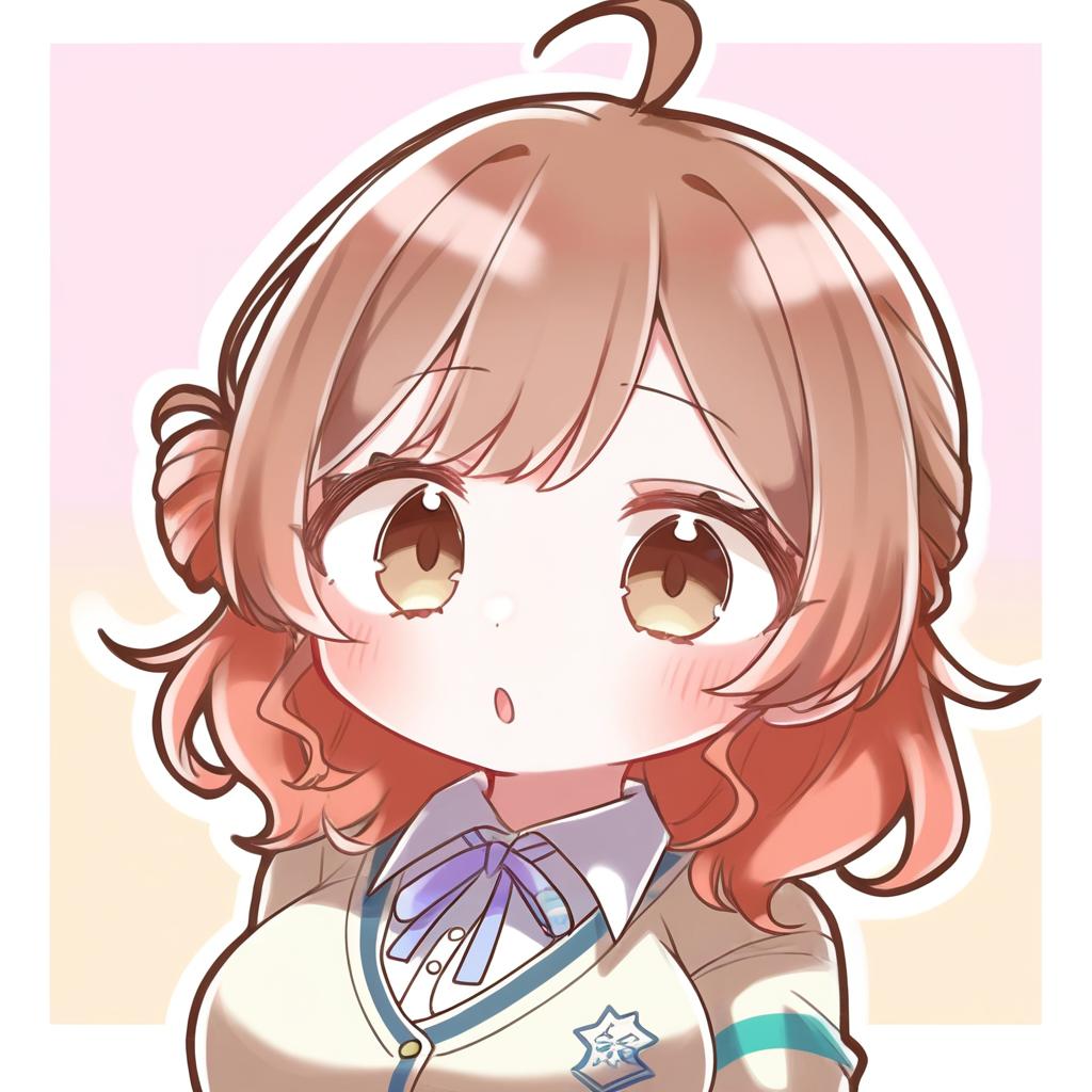 Hanami ume, gakuen idolmaster, 1girl, brown eyes, brown hair, gradient hair, medium hair, ahoge, single side bun, large breasts, school uniform, white shirt, by artist jako (jakoo21), leet