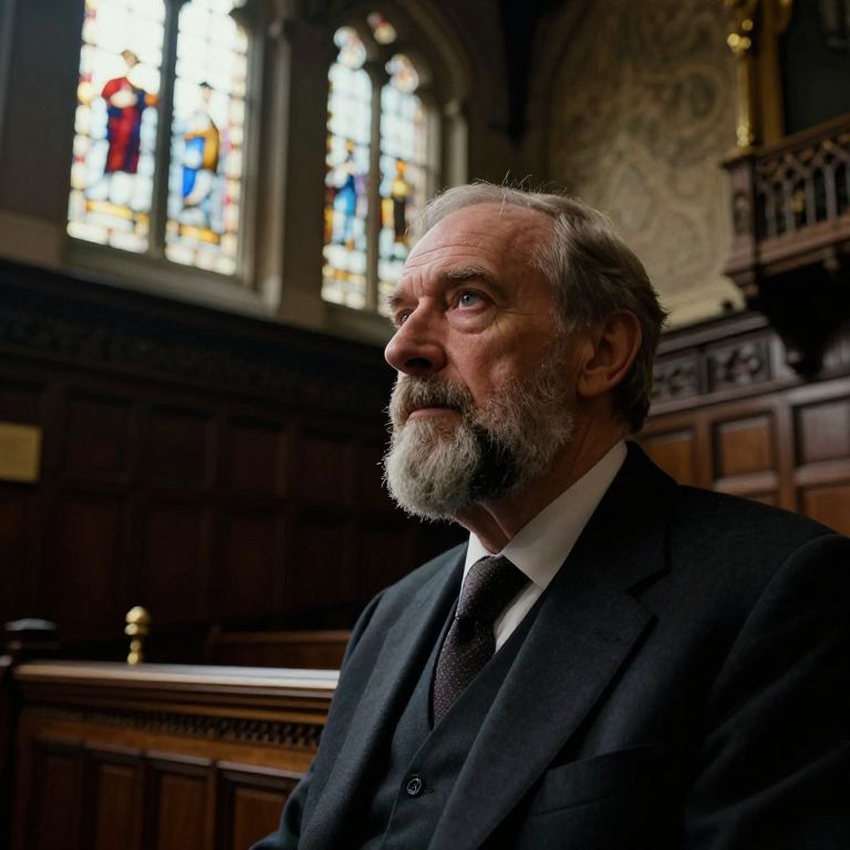 Create a portrait photograph that captures the essence of a seasoned politician; his face is weathered, with deep-set eyes and a grizzled beard. The subject is depicted from a low angle, gazing pensively into the distance, his distinguished presence emphasized by the camera perspective. The background is an intricate, vintage, wood-paneled room, reminiscent of an ancient parliamentary chamber. Soft, diffused light streams through tall windows with ornate stained glass, bathing the room in a warm glow and creating a sense of authority and introspection around the politician's silhouette. The lighting evokes a feeling of humility and contemplation, contrasting the grandeur of the setting.