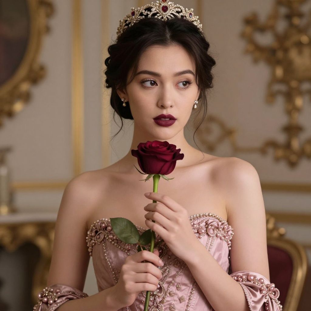 A regal woman in a luxurious pink dress holds a deep burgundy rose, her expression enigmatic as she gazes off to the side in a grand, ornate setting.