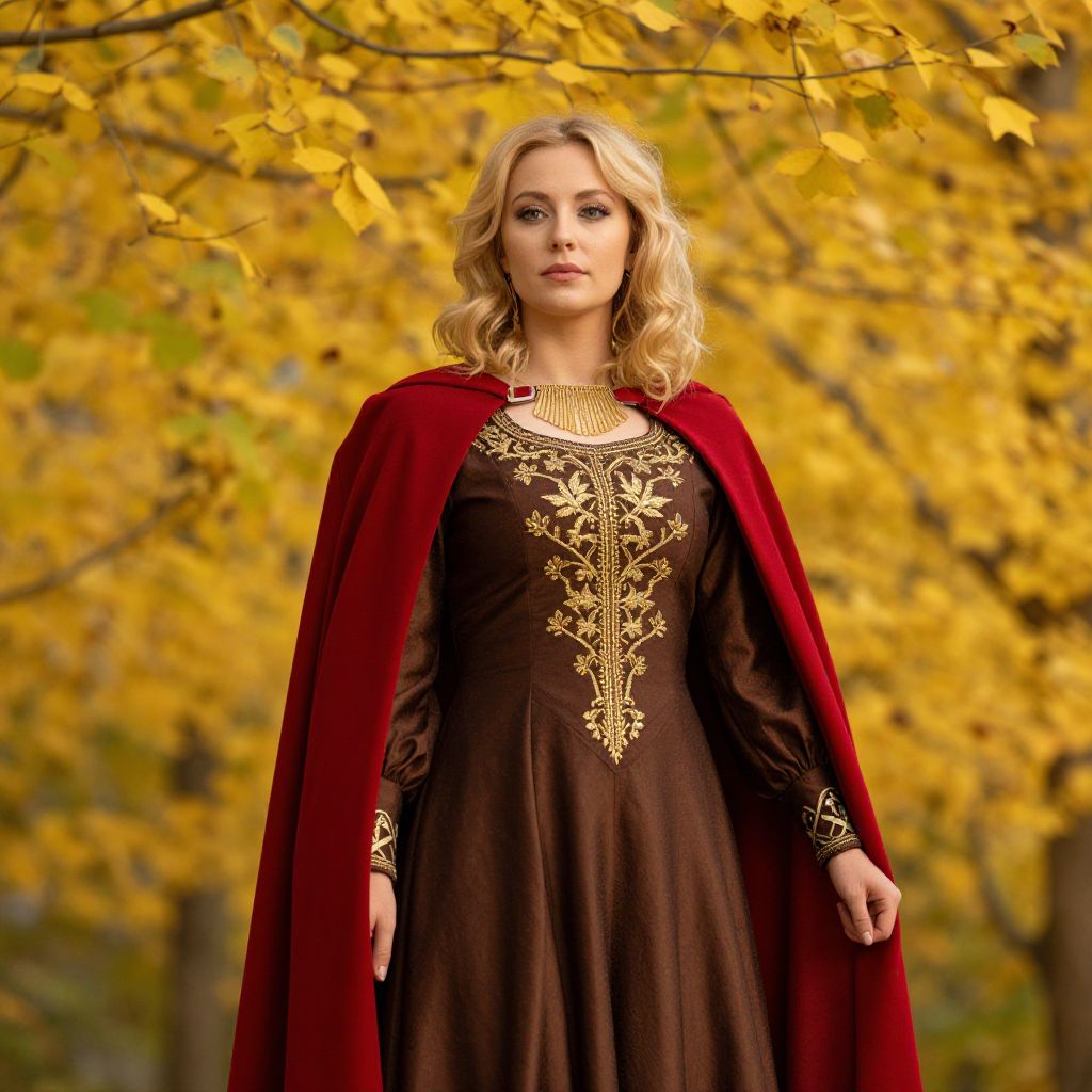 Woman with blonde hair wearing a brown dress with gold embroidery and a red cape. She is standing in front of a tree with yellow leaves.