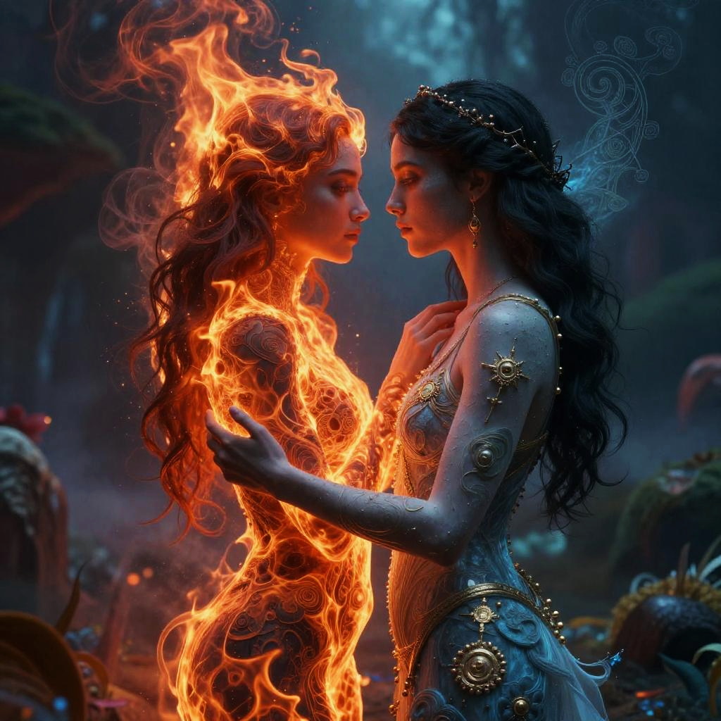 Opostas captured in a surreal landscape, two contrasting figures intertwined yet distinct, one vibrant and fiery, the other cool and serene, surrounded by symbolic elements representing duality, mystical atmosphere, detailed textures, vivid color contrast, dreamlike background.