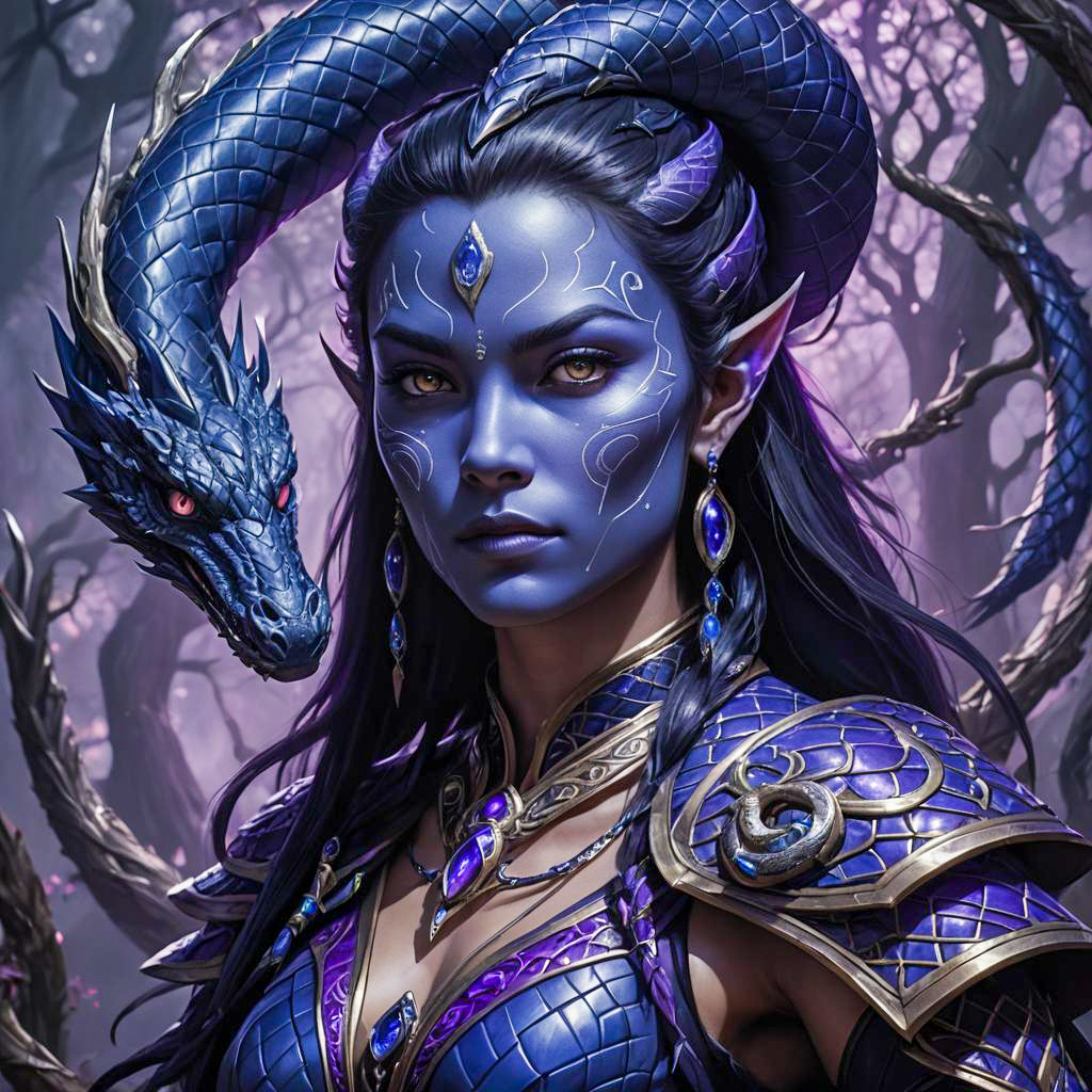 A highly detailed digital artwork of a female yuan-ti druid character from DnD 5e featuring half snake, half human traits. She has dark blue and violet snake-like scales covering her, intricate druidic jewelry with purple gemstones, and an intense, sinister gaze. The character holds a magical enchanted spear topped with a blue-scaled dragon head. The background depicts a mystical forest with dramatic lighting highlighting her detailed facial features and scale textures, embodying a yin-yang mystical aura.