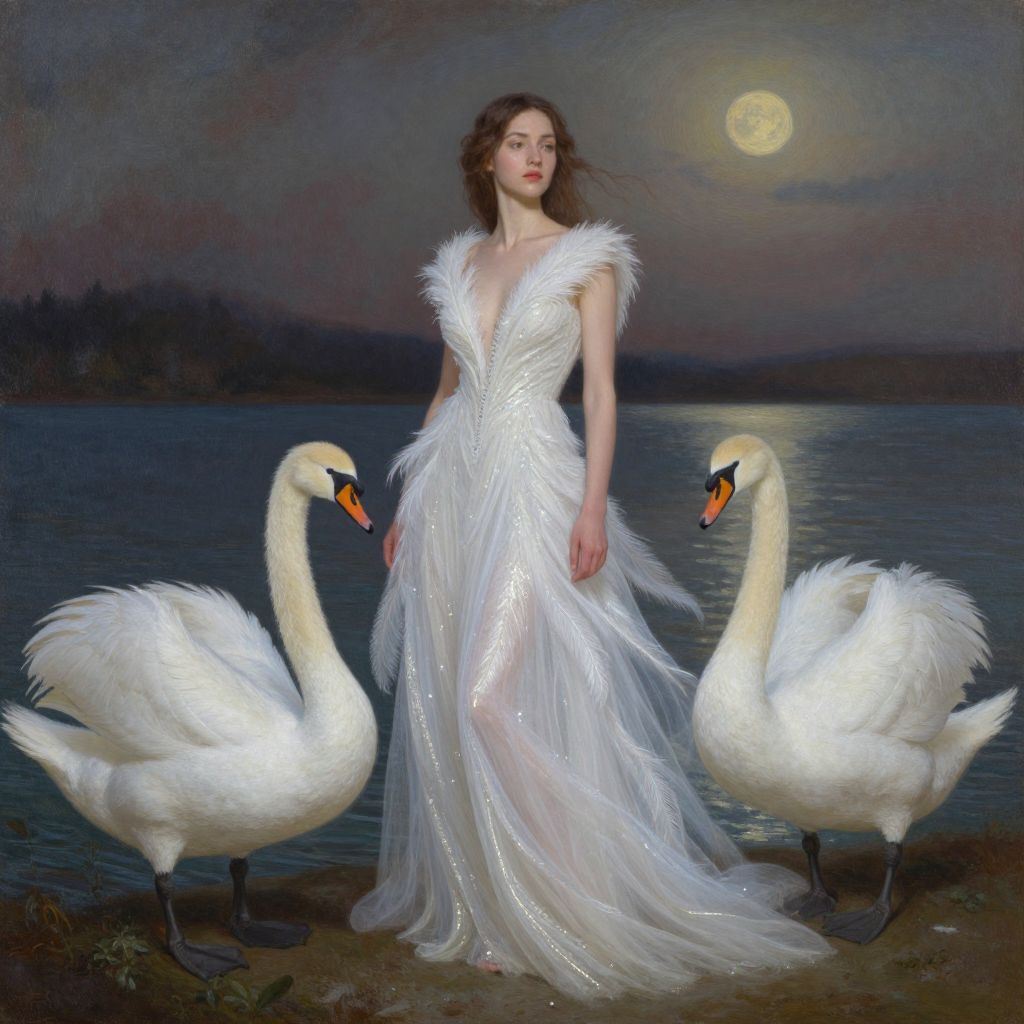 The image depicts a serene and ethereal scene featuring a woman dressed in a shimmering white dress adorned with feathers and glitter, standing near a body of water. The dress is intricately detailed, with delicate textures and a flowing, ethereal quality. Surrounding her are three white swans, their feathers blending seamlessly with the background, creating a sense of harmony and tranquility. The background is a mix of dark and light tones, with a moonlit atmosphere that casts a soft, ambient light over the scene, enhancing the ethereal quality. The overall composition is balanced, with the woman and swans positioned centrally, and the water and sky forming a natural frame. The painting style is reminiscent of Pino Daeni, Gerhartz, and Anna Dittmann, characterized by detailed brushstrokes and a focus on light and texture. The interplay of colors, textures, and shapes creates a visually rich and dynamic scene, capturing a moment of peaceful elegance.
