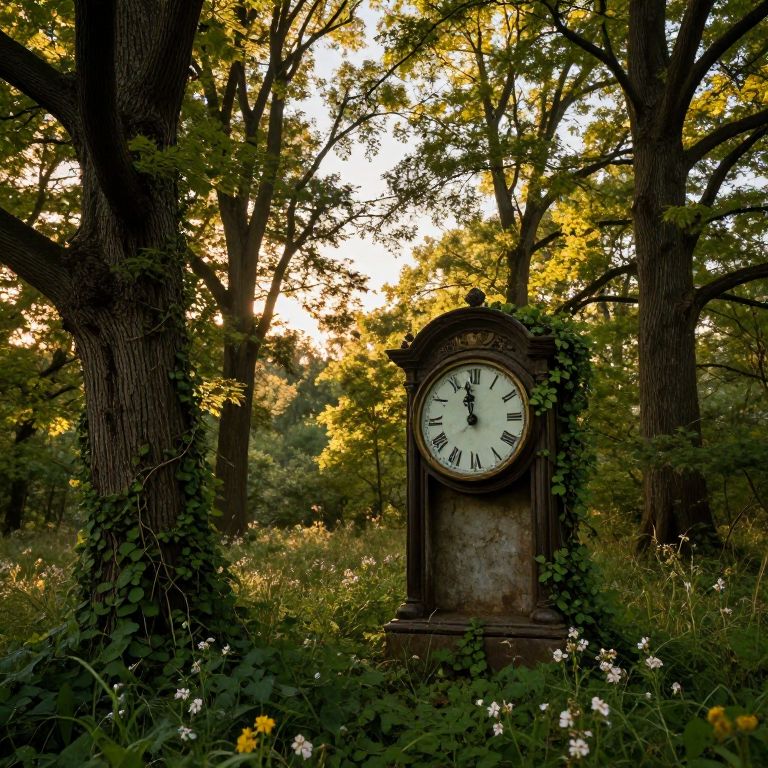 A surreal scene depicting a forest with large clock faces embedded in spiral tree trunks. The clocks feature Roman numerals and brass gears that interlock around the trunks and roots. The clocks run backward as the sun sets, casting a warm glow through the tall pine trees and creating a mystical atmosphere.