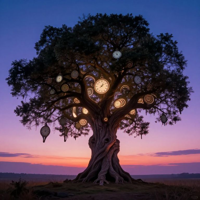 A forest of clocks grows in spiral trunks, their gears interlocking like tree roots, each timepiece running backward while the sky pulses with reverse sunsets.