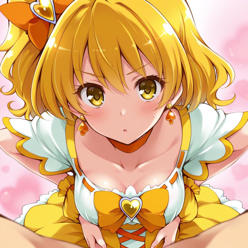 Cure pine, precure, 1girl, yellow eyes, brown eyes, short hair, blonde hair, heart hair ornament, hair bow, orange choker, earrings, magical girl, one side up, magical girl, wrist cuffs, by artist paopao, illustrious