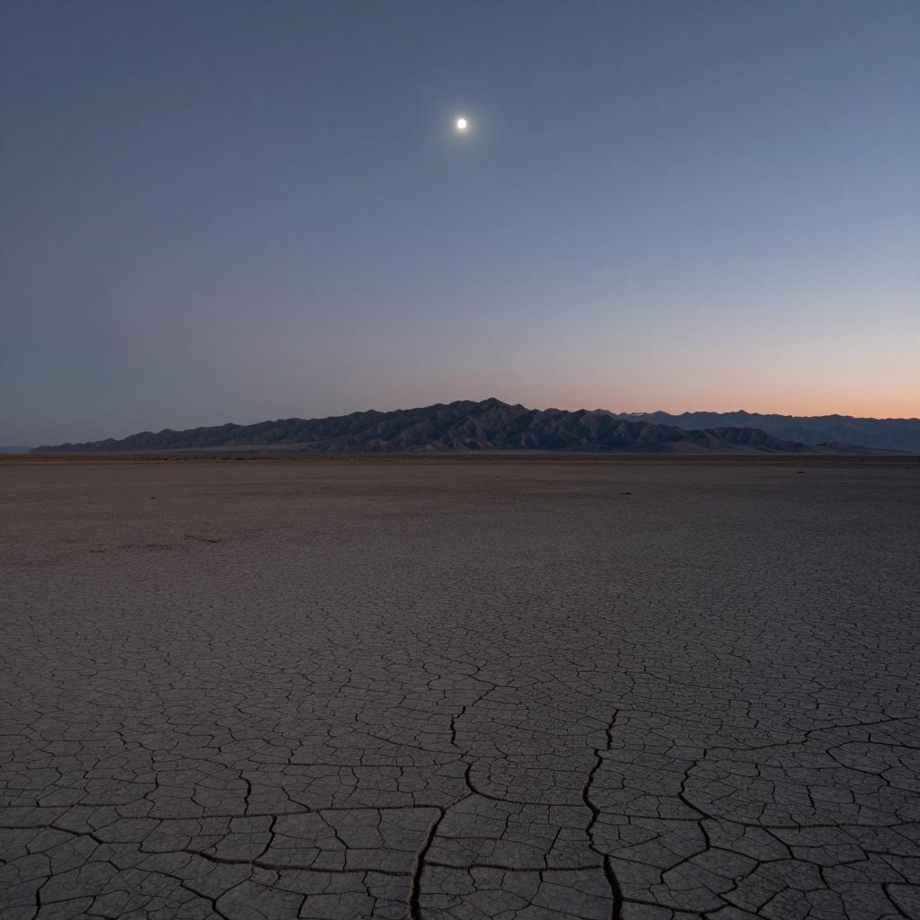 Minimalist landscape of cracked earth flats under a serene twilight sky with a visible moon. The barren terrain extends towards distant silhouetted mountains, captured with long-exposure technique in a tranquil nighttime setting.