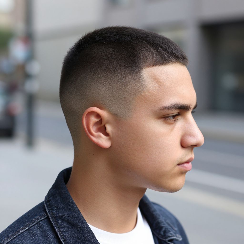 What would I look like with a buzz cut, side profile of a confident adult with a clean buzzed haircut, sharp jawline, warm tones, studio lighting, minimalistic backdrop, high detail on skin and hair stubble, expressive eyes, contemporary fashion.