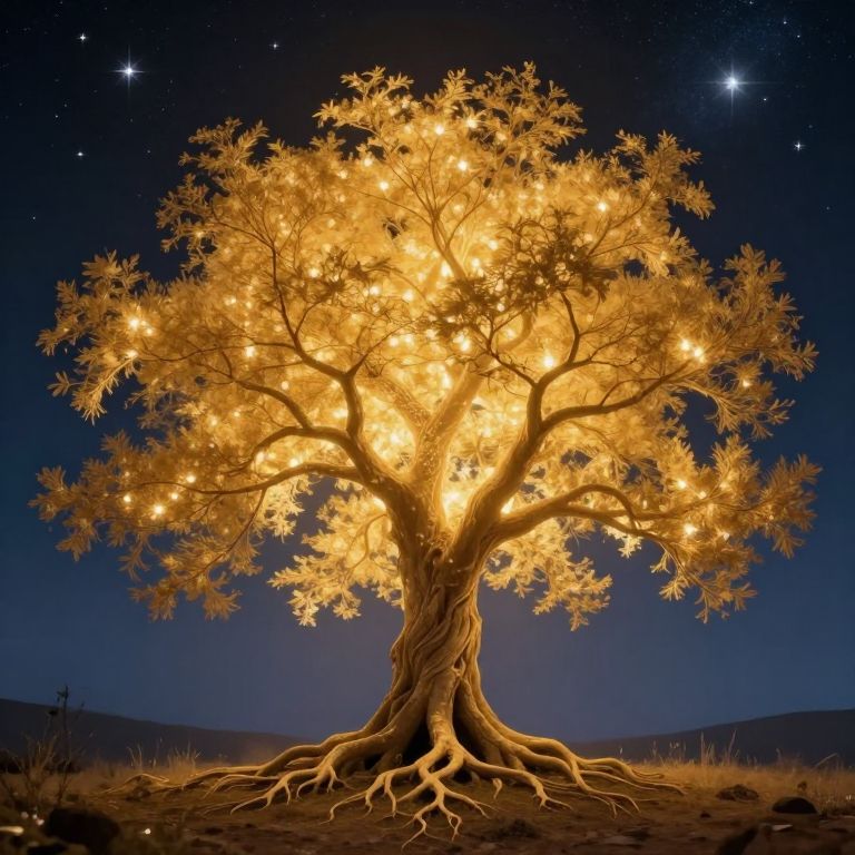An ethereal tree of golden light stands as a beacon of serenity, its branches reaching toward the cosmos while its roots anchor deeply into the earth, embodying the eternal dance between the heavens and the heart.