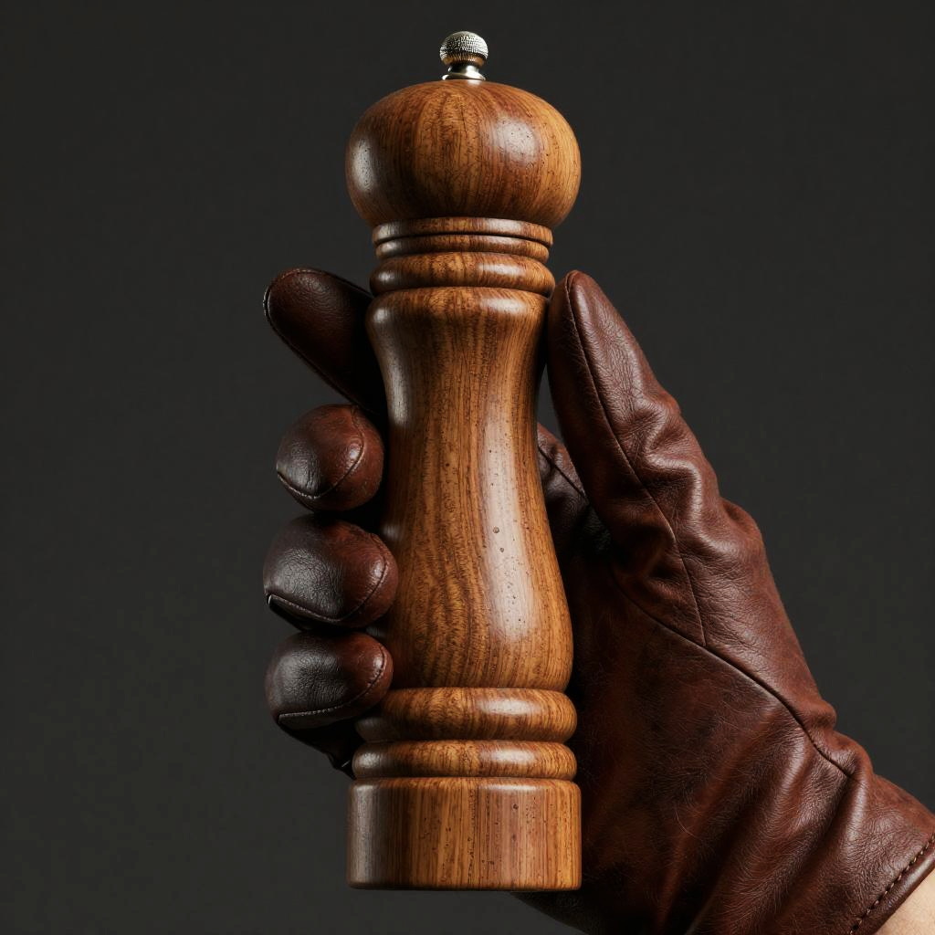 Photograph of a hand gripping a wooden pepper mill against a dark, solid background. The pepper mill is crafted from polished, rich brown wood with a smooth texture and rounded edges. The hand, adorned in dark brown leather gloves, holds the mill vertically, showcasing its cylindrical shape and ridged base. The top of the mill features a metallic knob, adding a slight contrast to the wooden surface. The image highlights the texture and craftsmanship of both the pepper mill and the gloves, creating a sense of warmth and elegance.